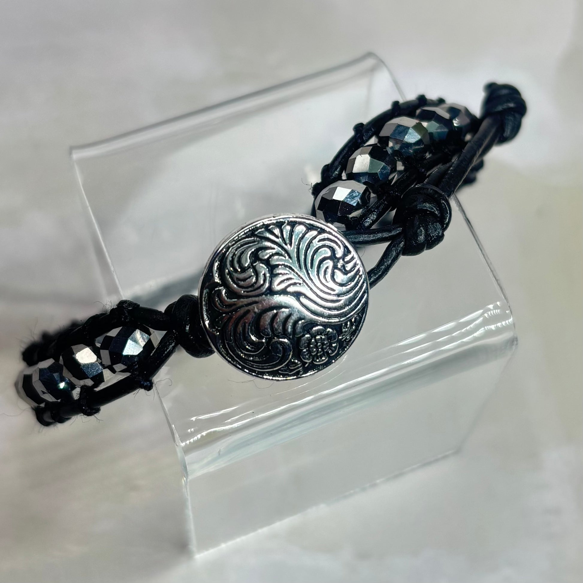 Ein sehr schönes Armband aus schwarzen Lederband und silbernen Glasschliff Perlen in der Größe 17.
