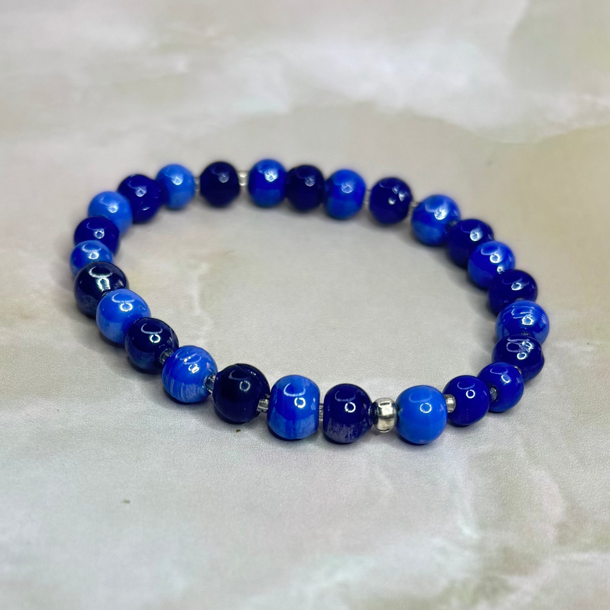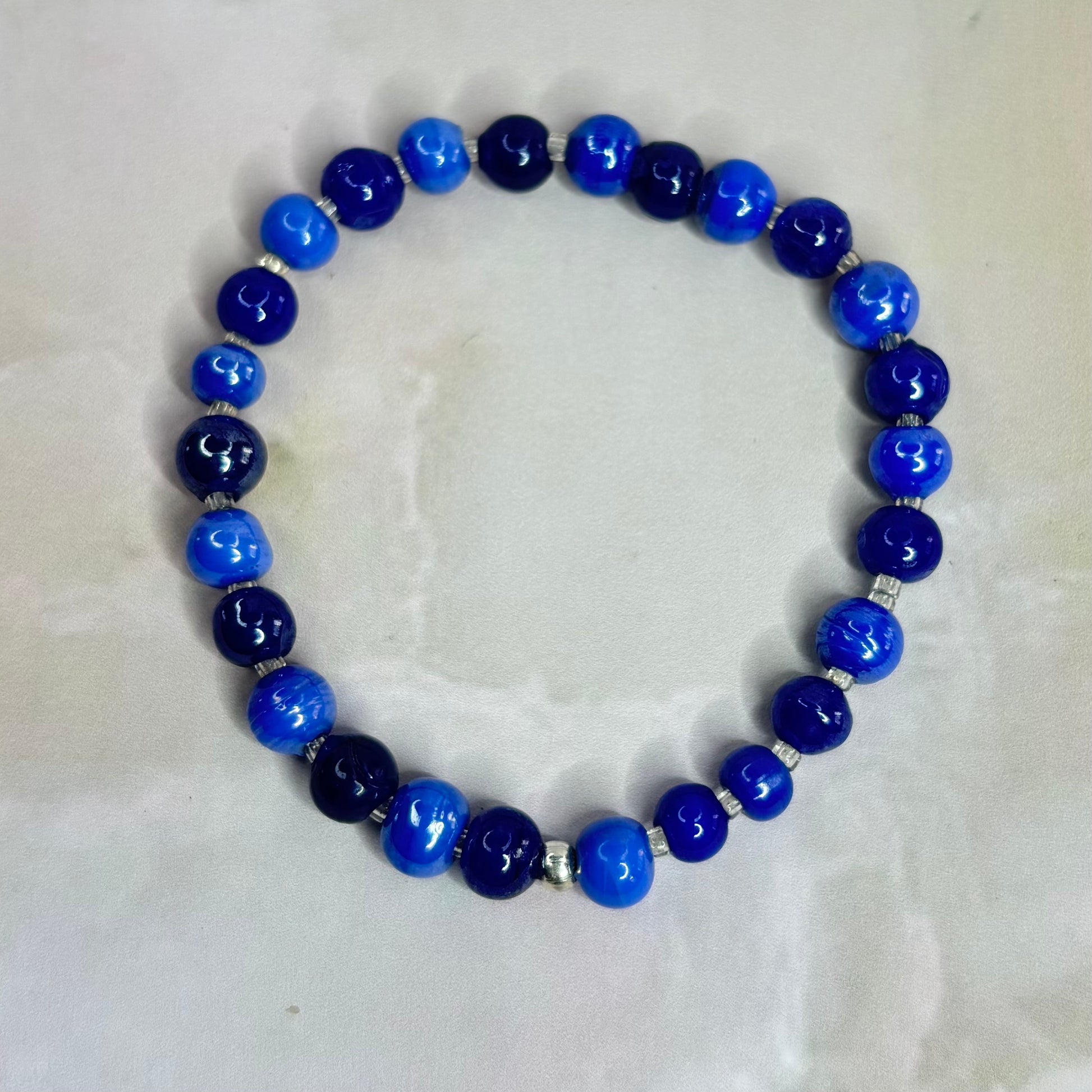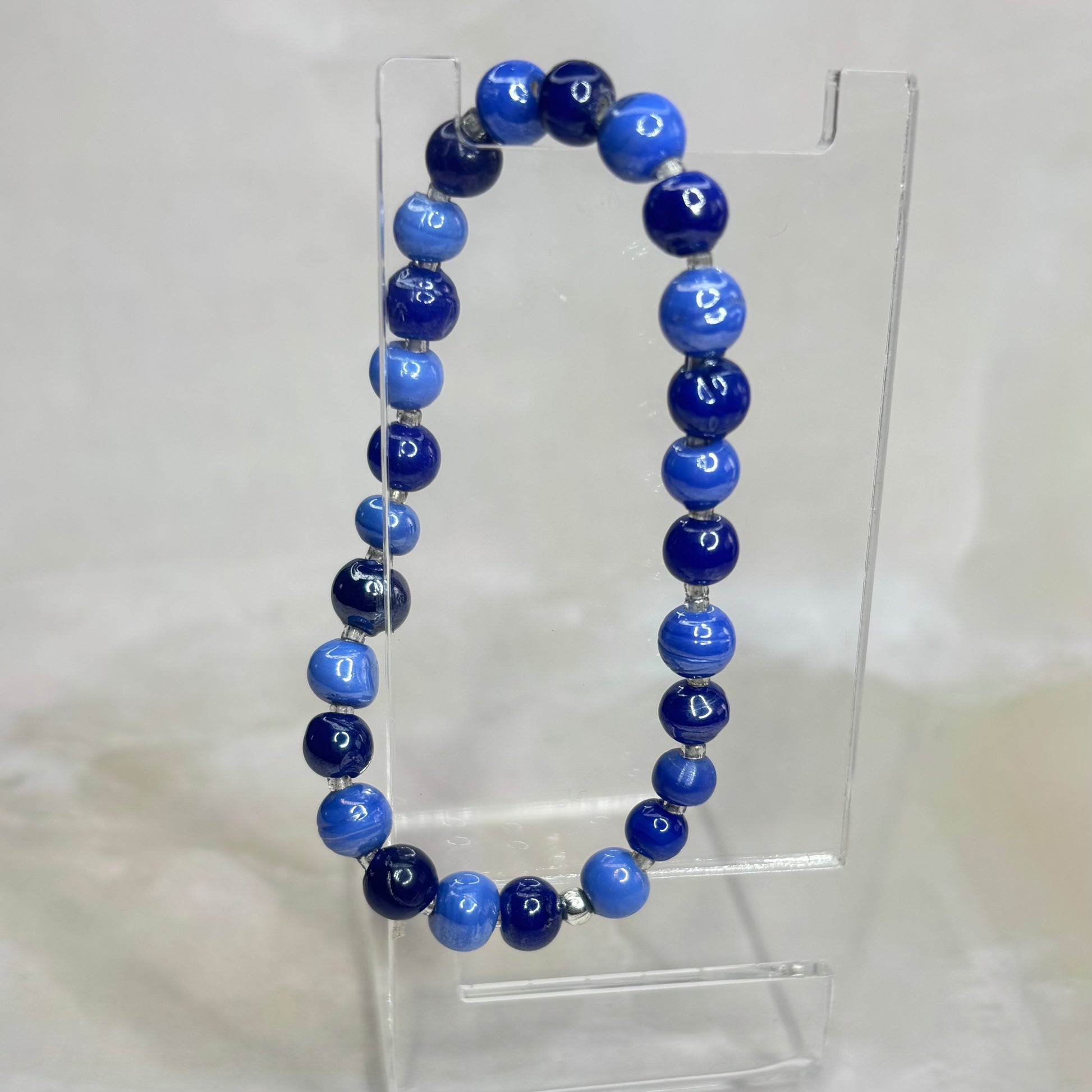 Ein sehr schönes elastisches Armband aus blauen Glasperlen in der Größe 15.