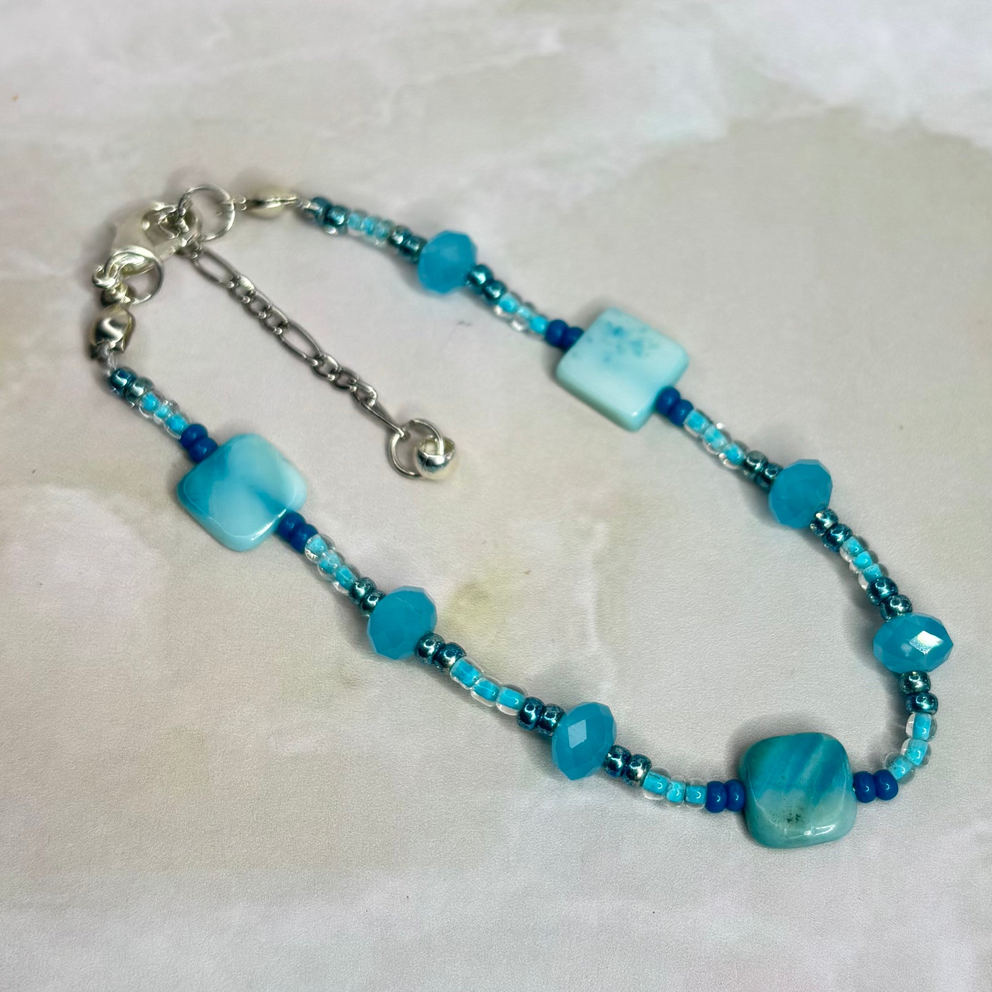 Ein sehr schönes Armband aus Glasschliff Perlen, Muschel Perlen und rocalles in der Farbe türkis. Größe 18.