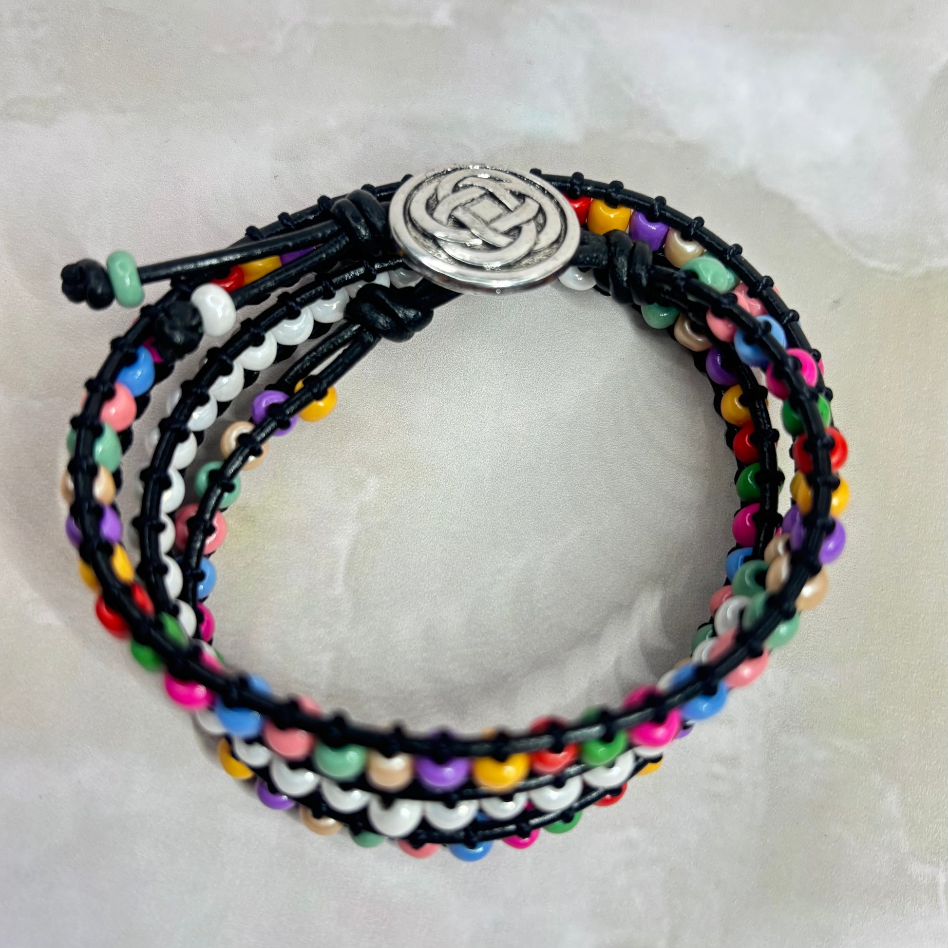 Ein sehr schönes Wickelarmband aus schwarzen Lederband und weiß / bunten rocalles . Größe 15.