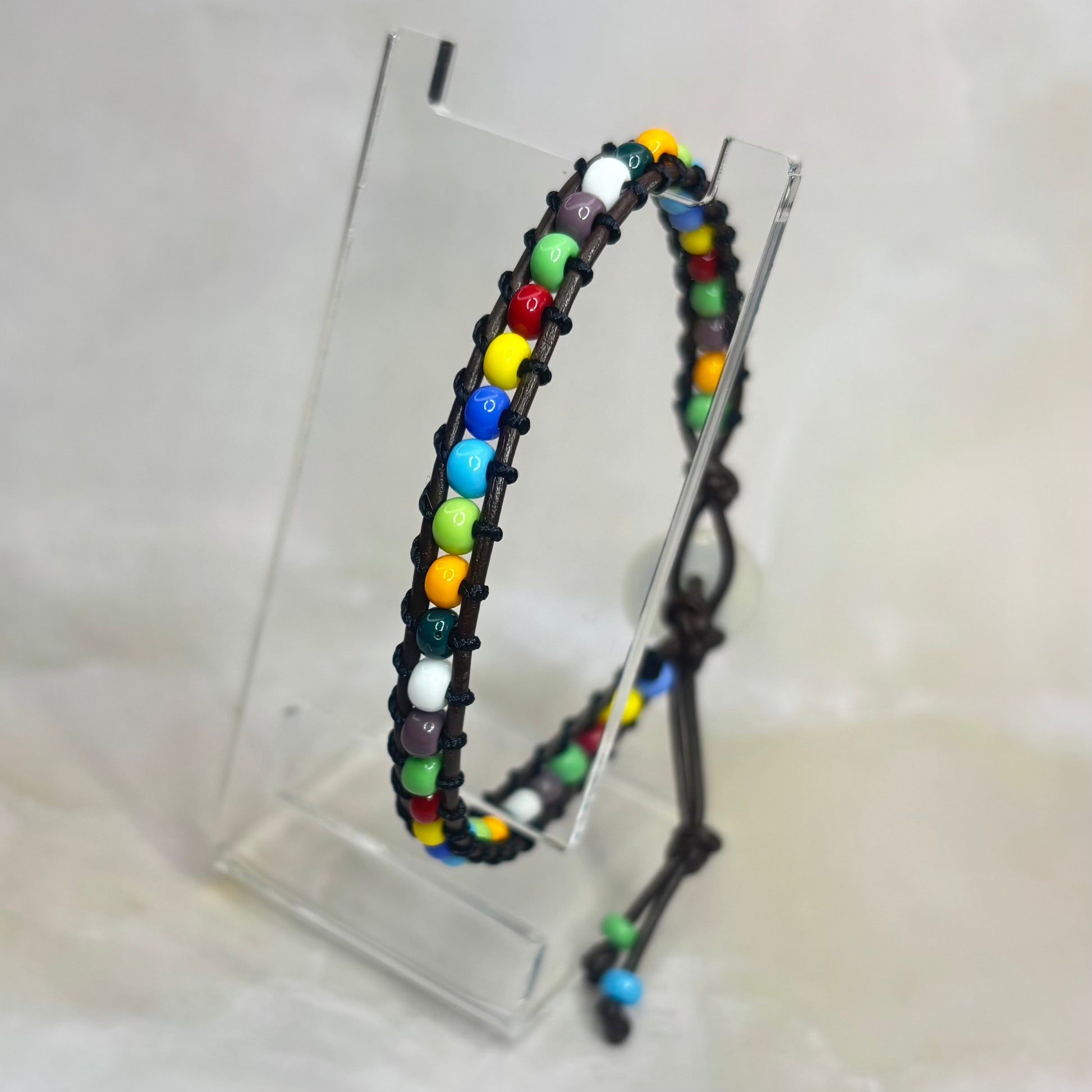 Ein sehr schönes Armband aus braunen Lederband und bunten rocalles. Größe 17.