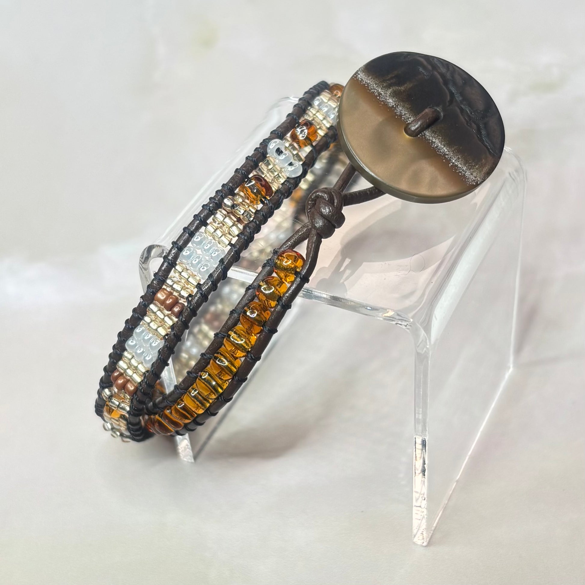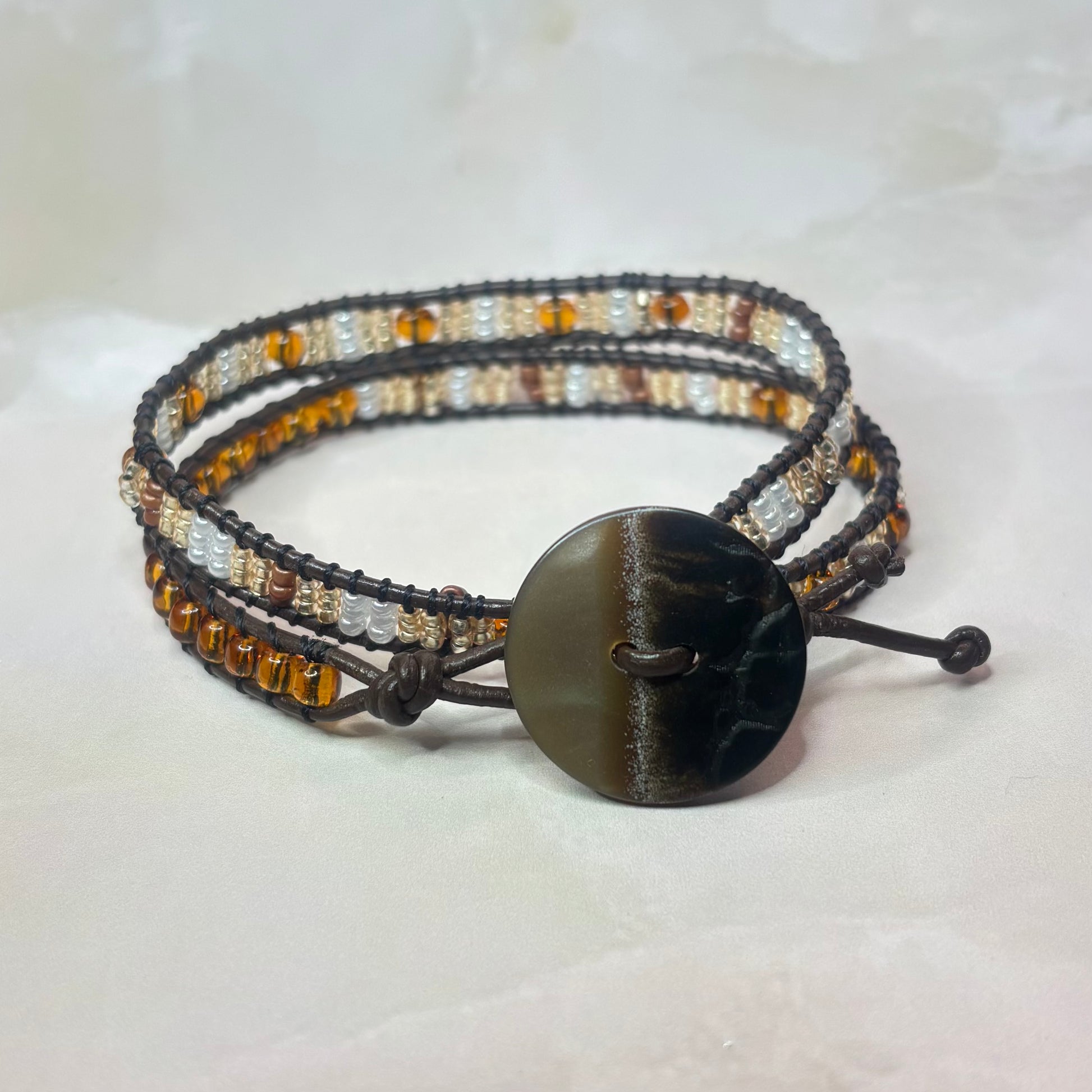 Ein sehr schönes Wickelarmband aus Lederband und rocalles in der Farbe braun / weiß / gold.Größe 16.