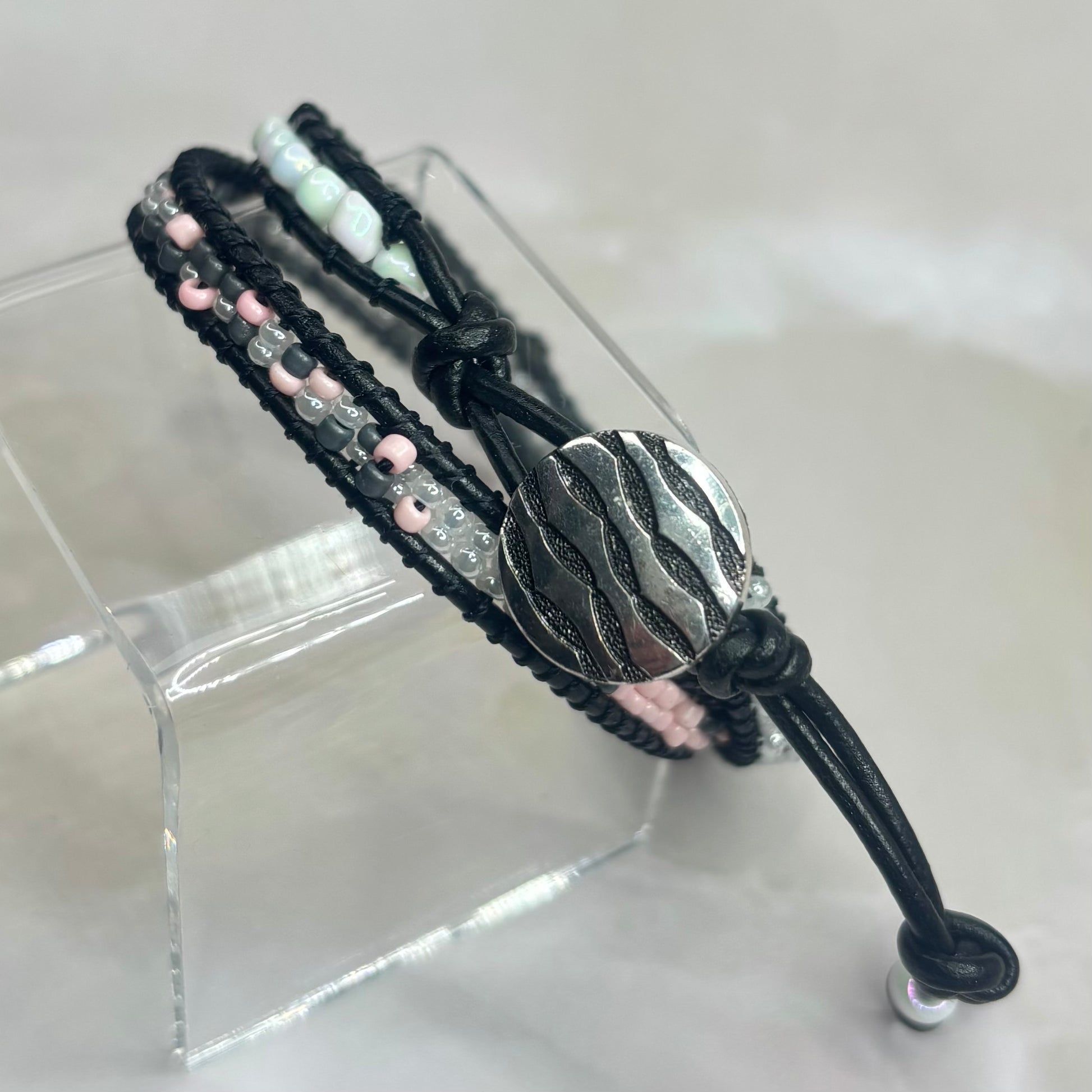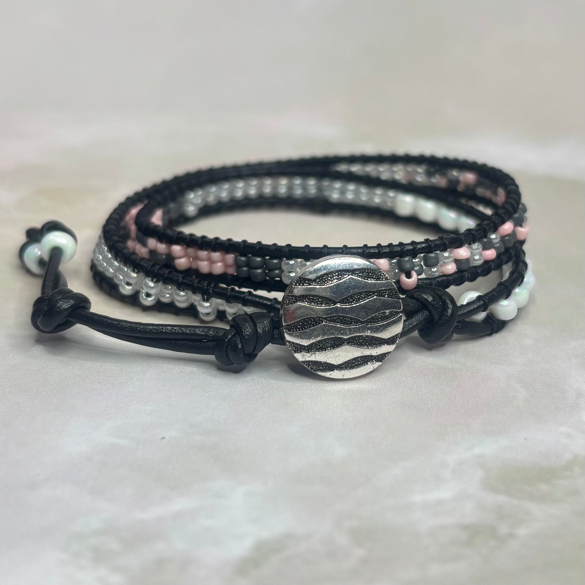 Ein sehr schönes Wickelarmband aus schwarzen Lederband und weiß/ rosa / grau rocalles. Größe 15.