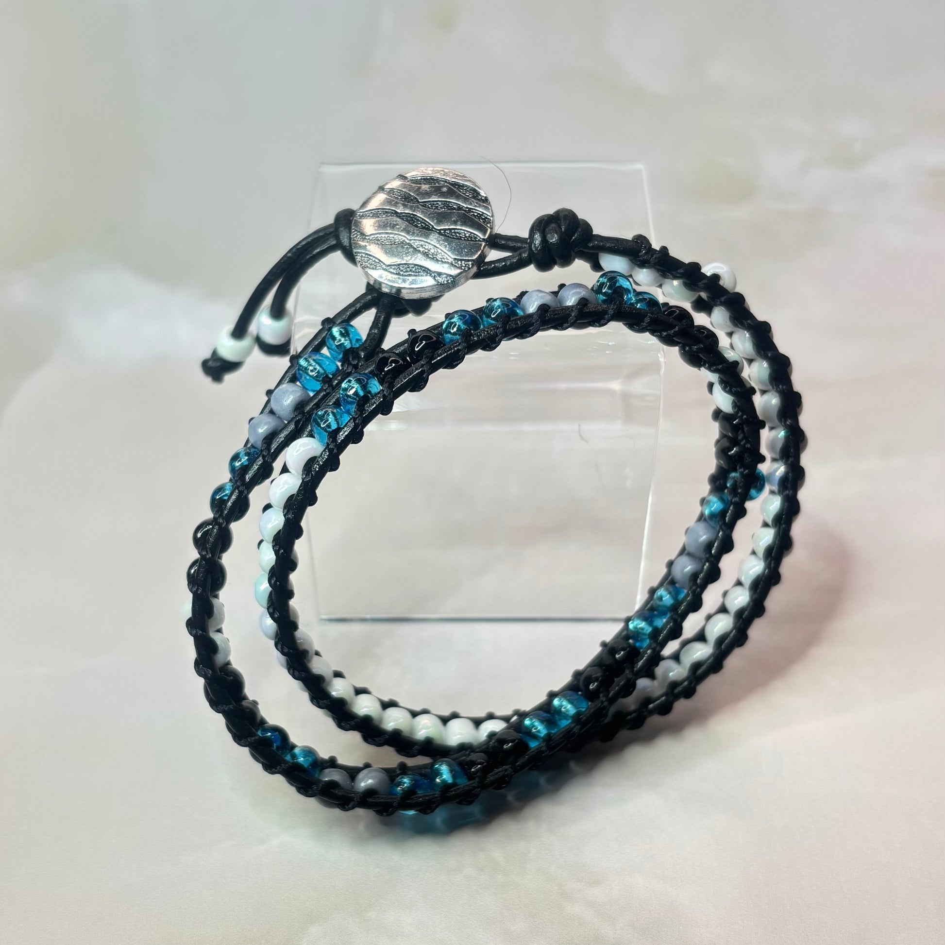 Ein sehr schönes Wickelarmband aus schwarzen Lederband und weiß/ blau und schwarze rocalles Perlen.Größe 16.