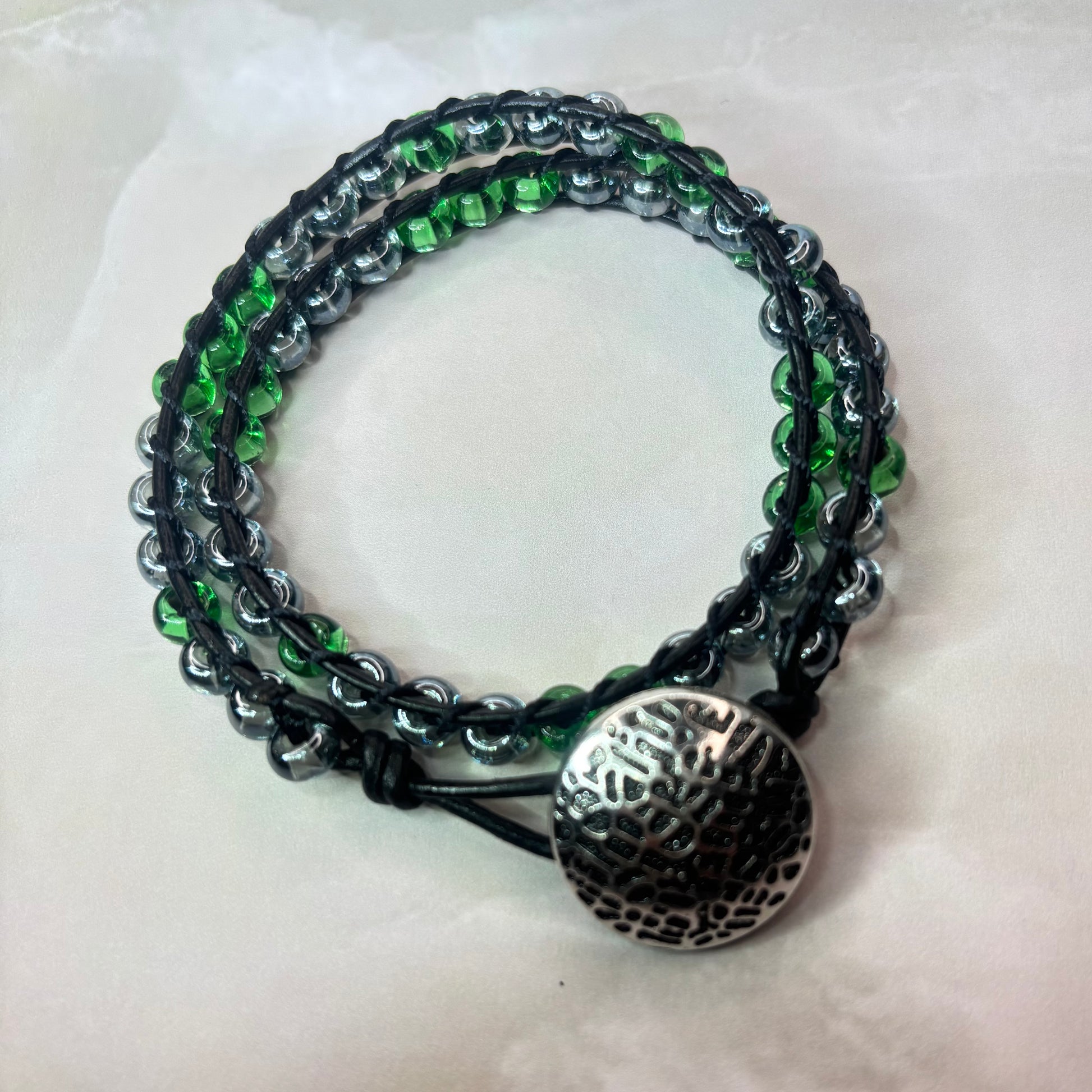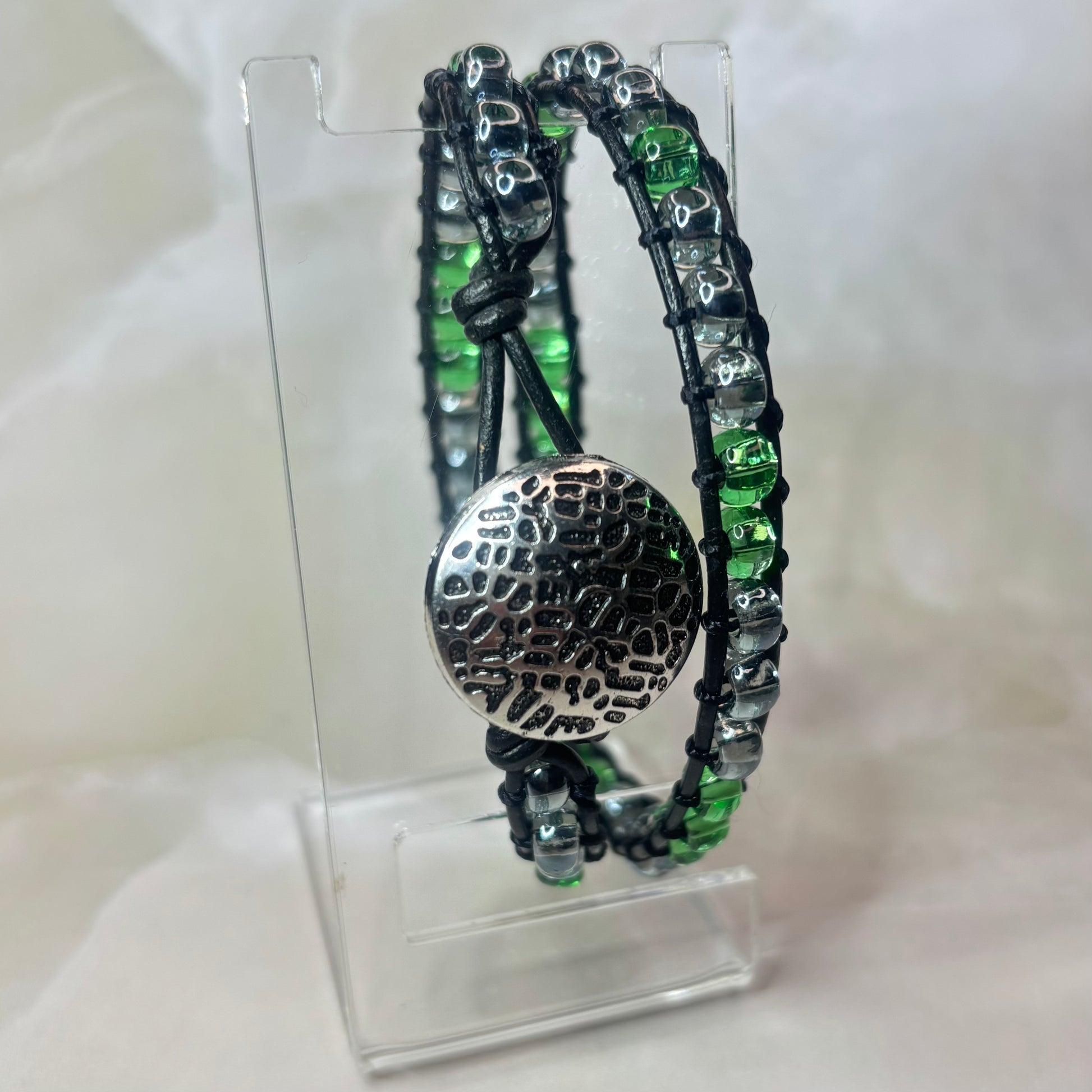 Ein sehr schönes Wickelarmband aus schwarzen Lederband und grün/grauen großen rocalles.Größe 18.