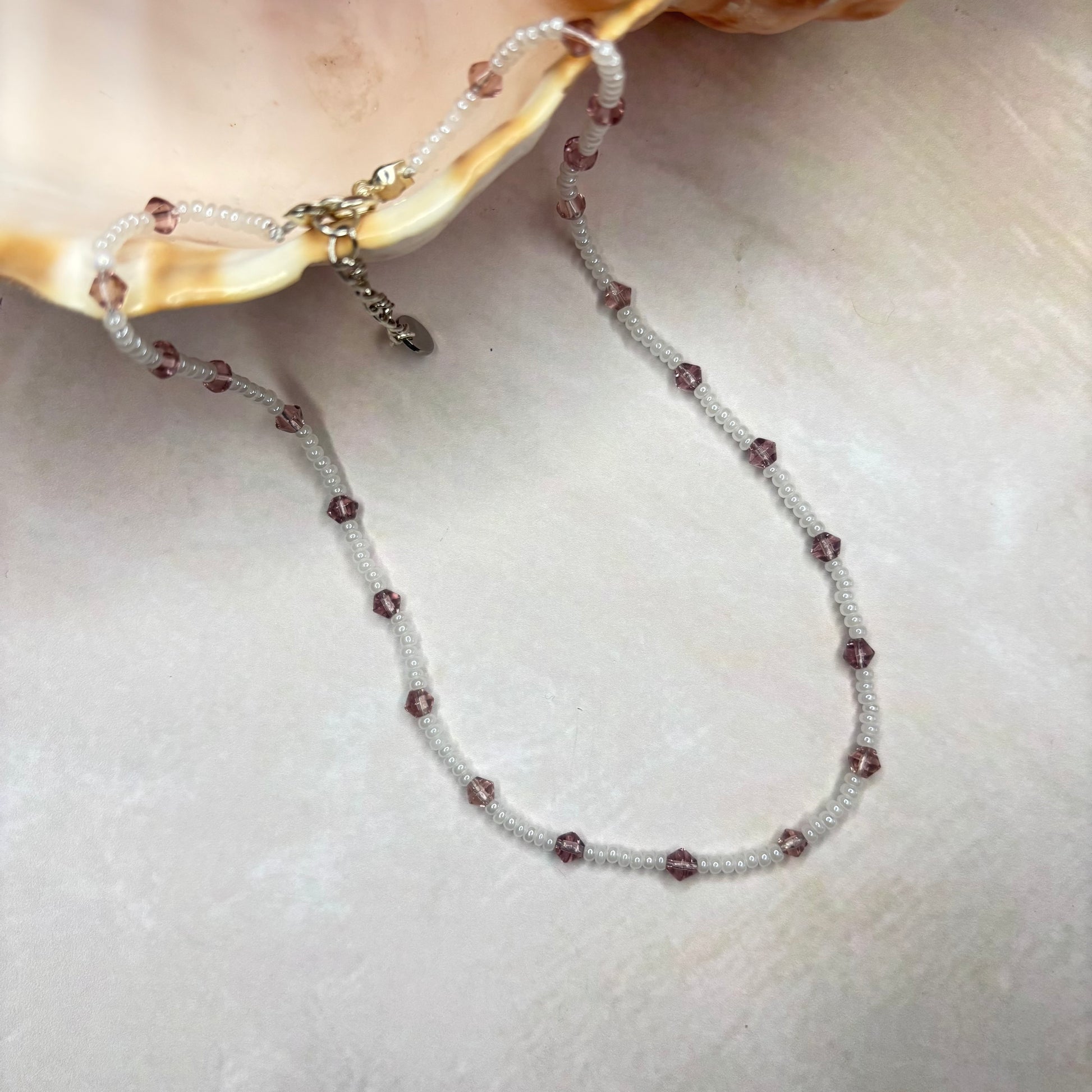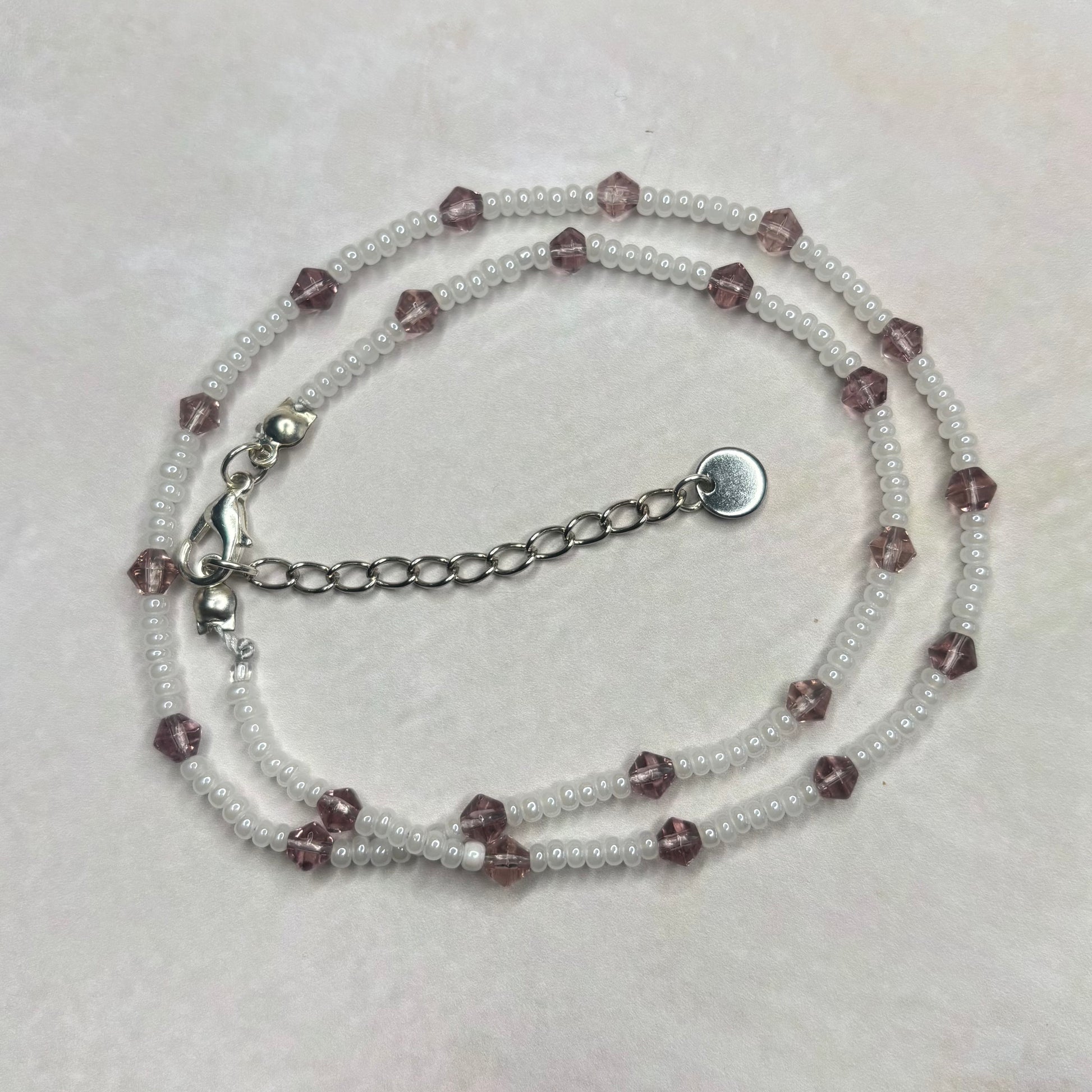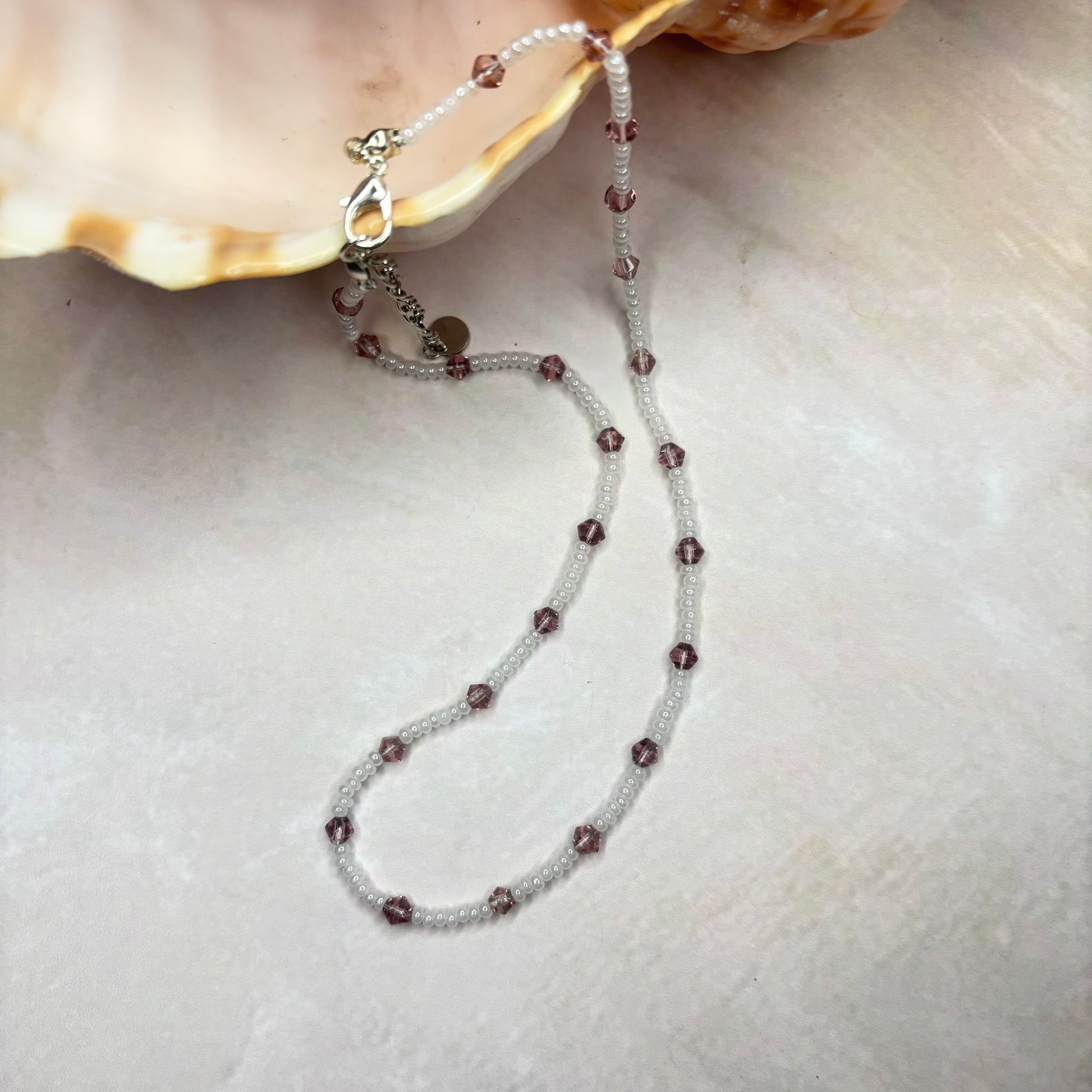 Eine sehr schöne dezente Kette aus weißen rocalles und Lilianen Glasschliff Perlen.Die Länge beträgt 42 cm und 5 cm Verlängerungs Kettchen.