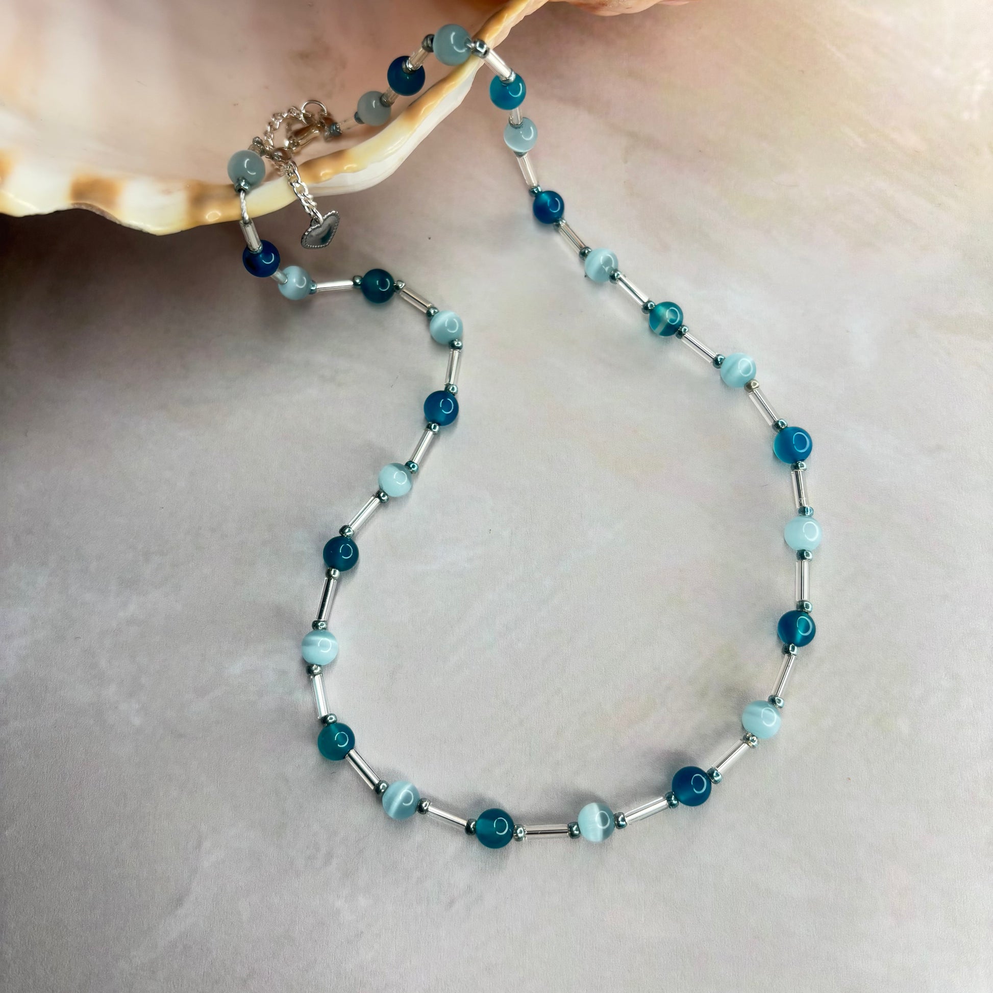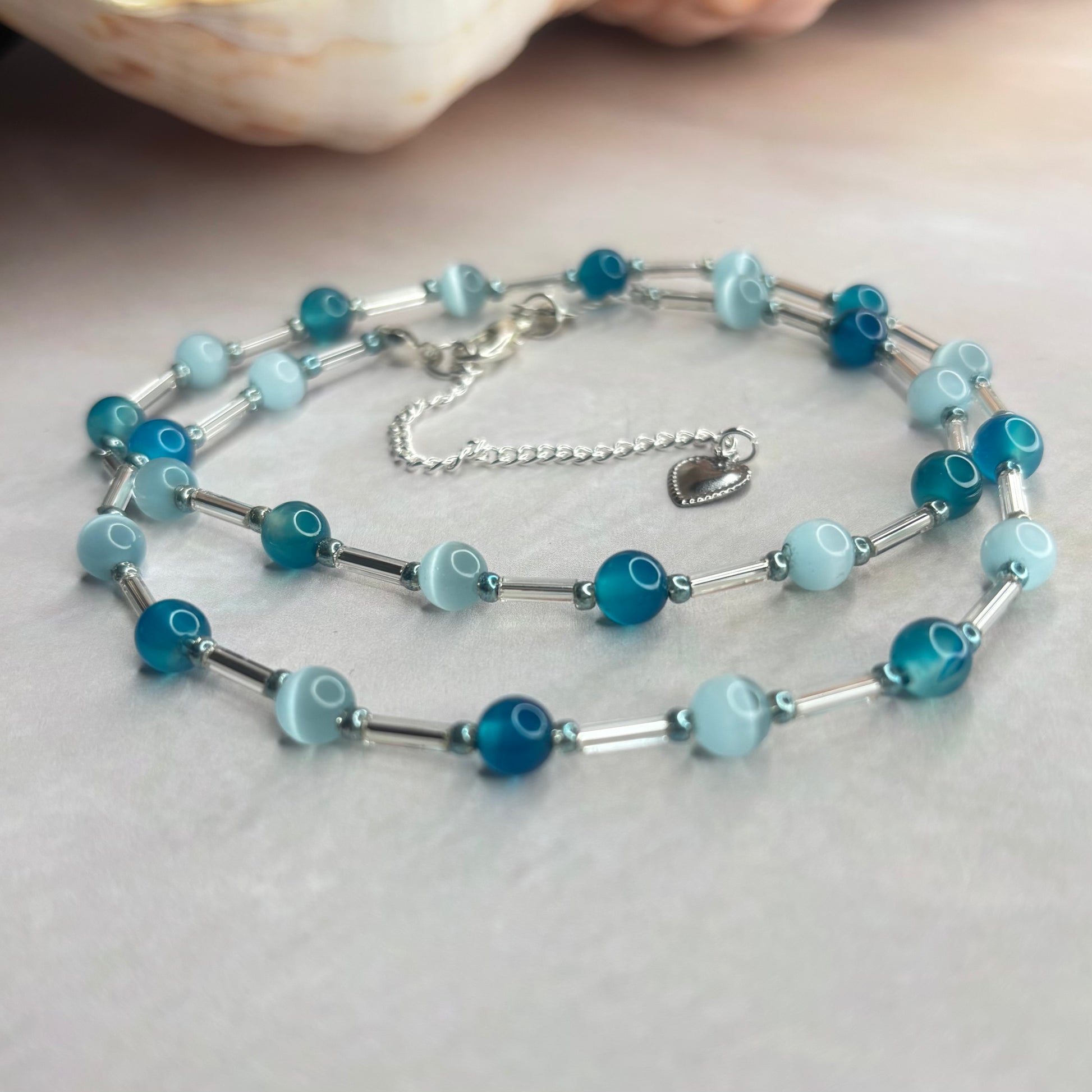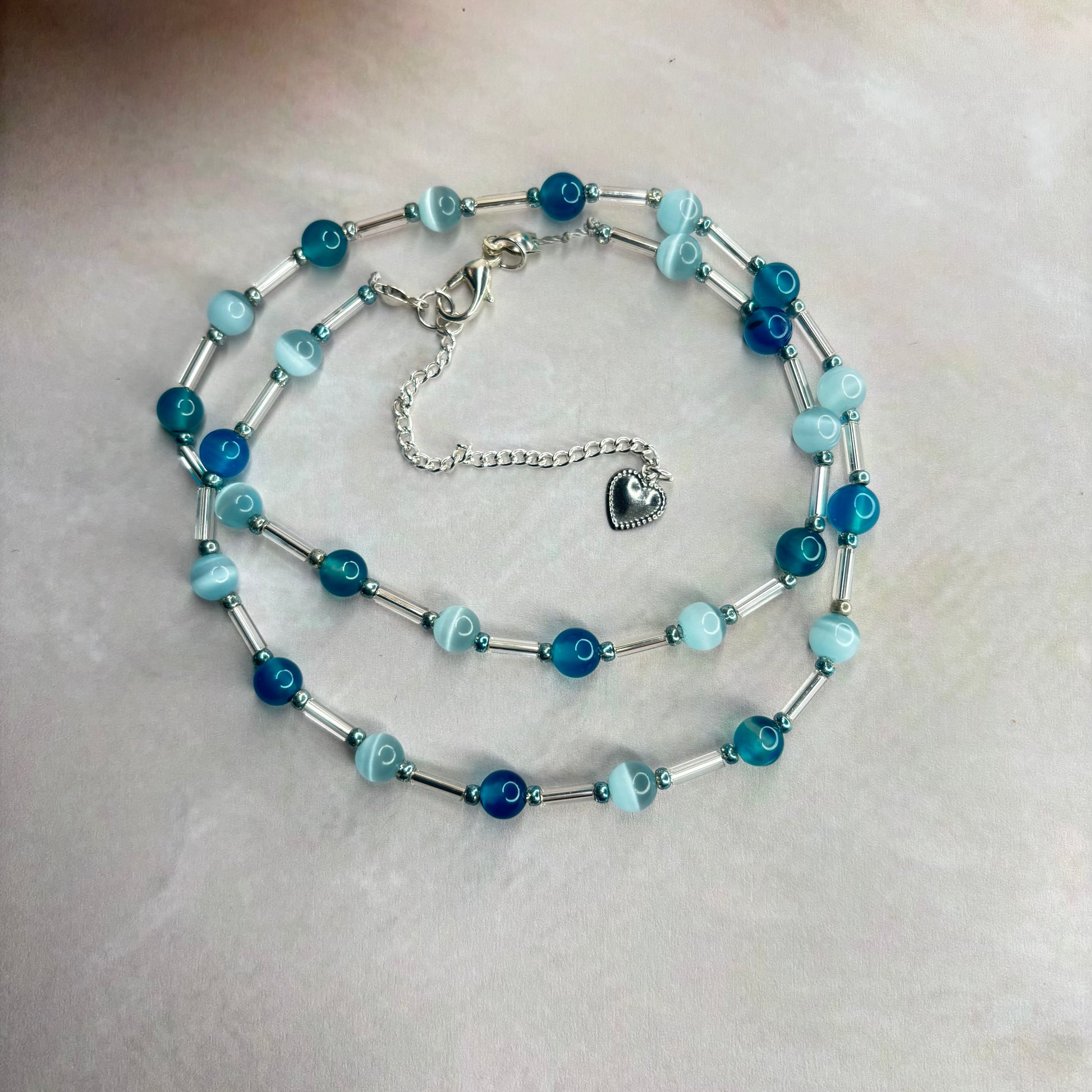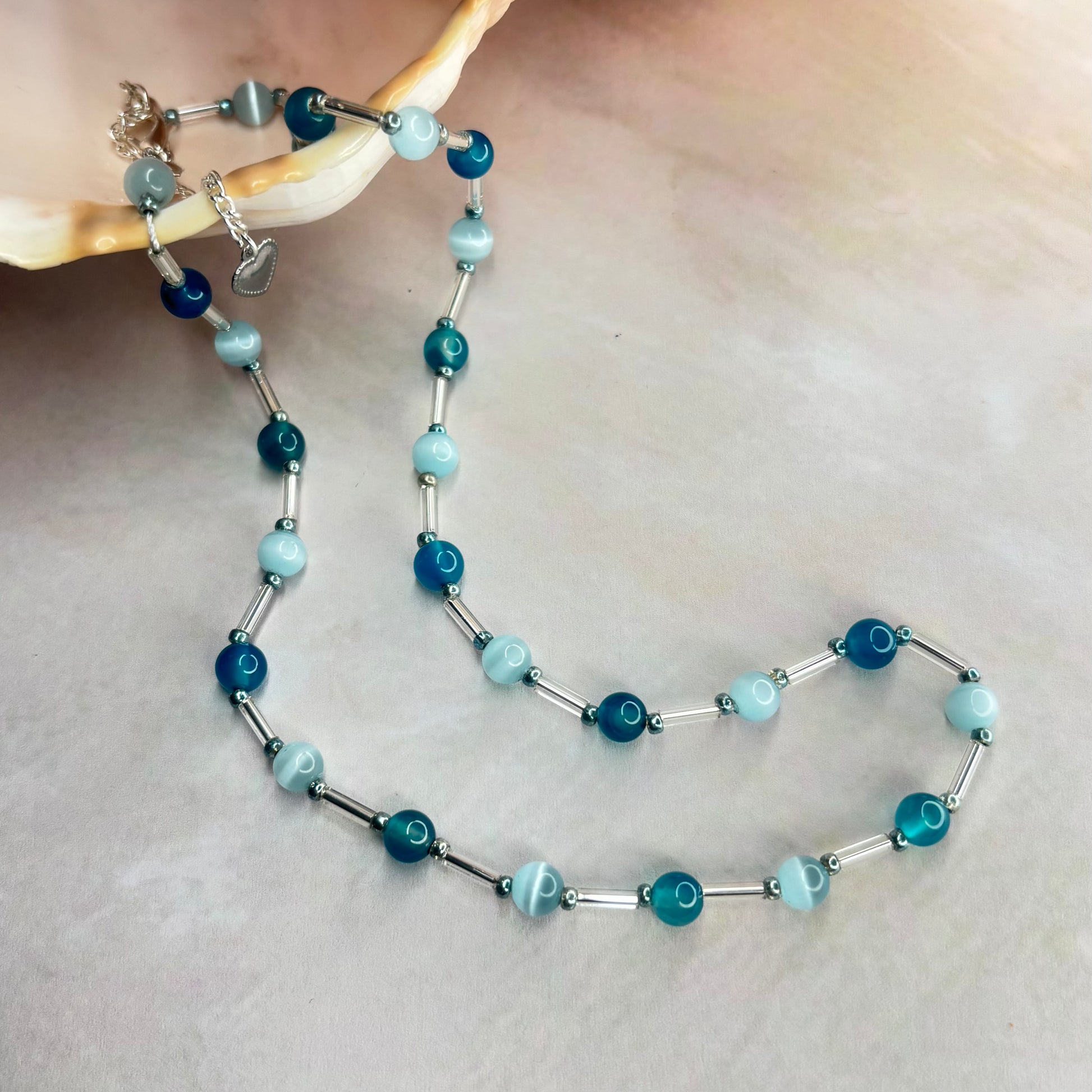Eine sehr schöne Kette in der Farbe hellblau/ türkis / Silber aus Glasperlen und Stift Perlen.Die Länge beträgt 47 cm und 6 cm Verlängerungs Kettchen.Eine Kette für jeden Anlass.