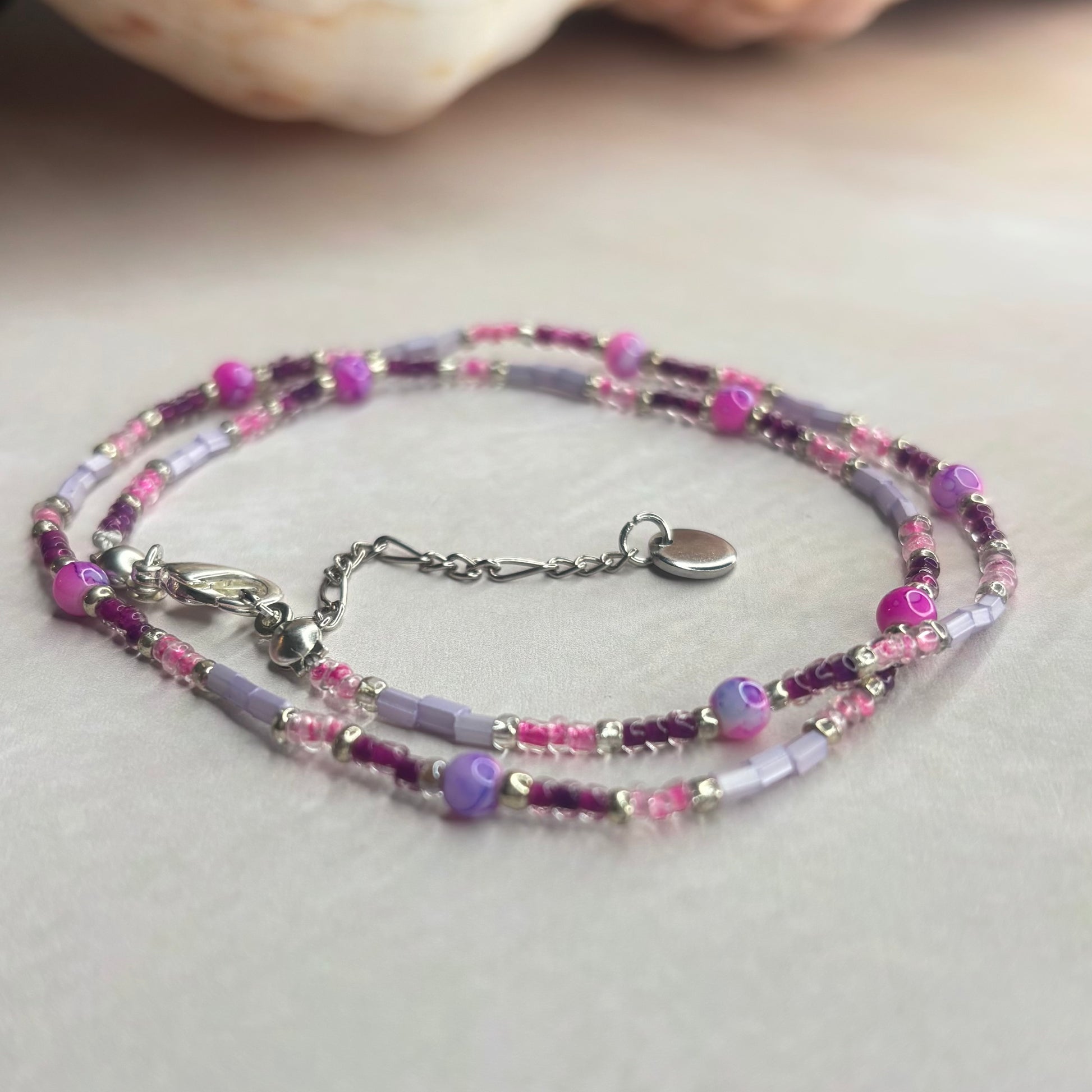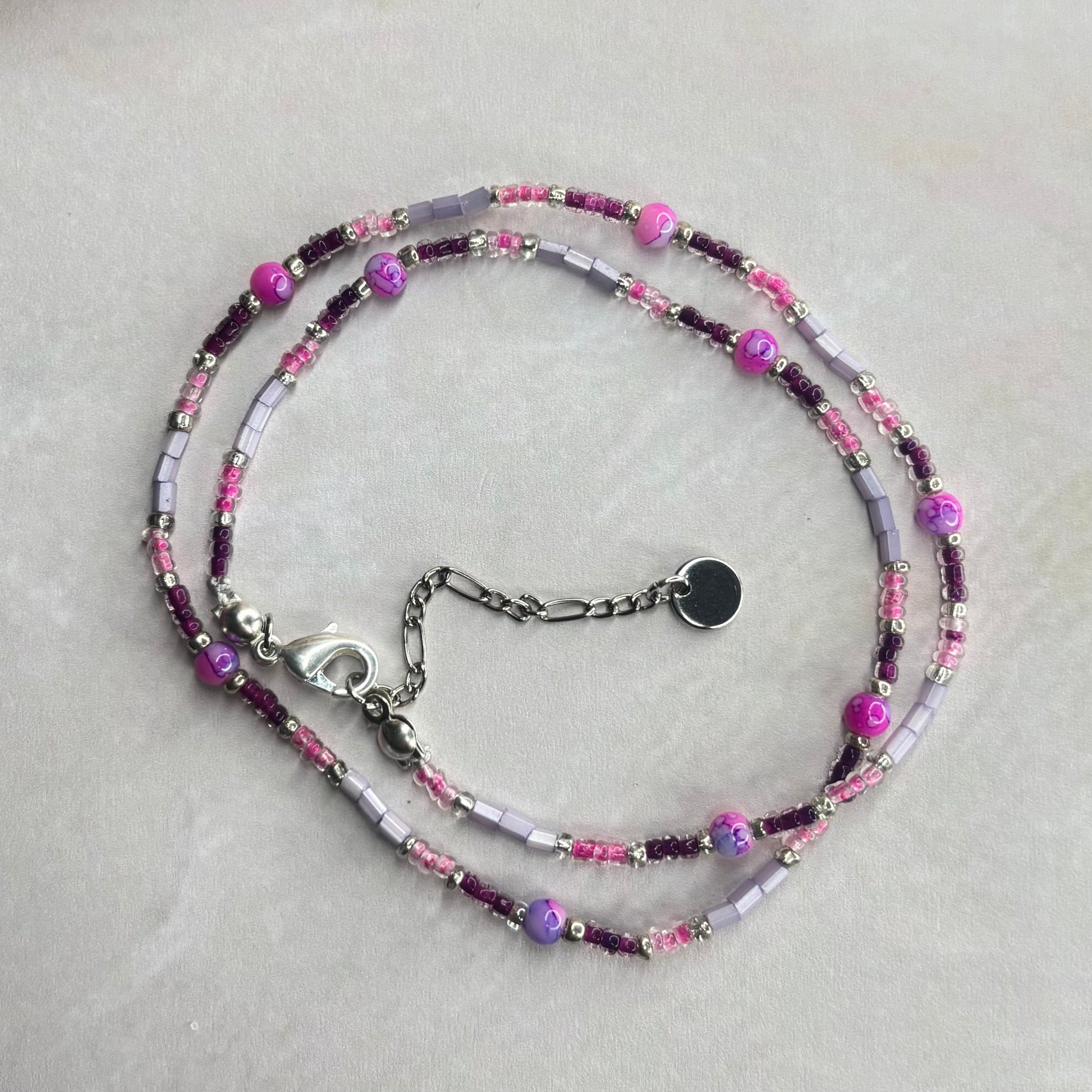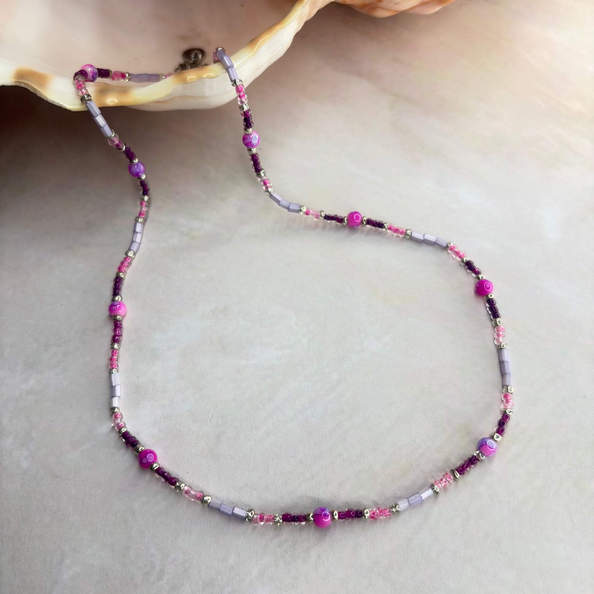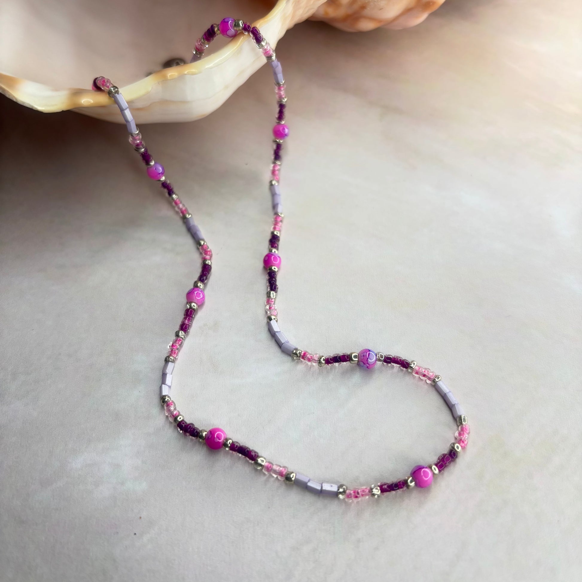 Eine sehr schöne ,dezente Kette in der Farbe pink/ lila/ Flieder aus Glasperlen und verschiedenen rocalles.Die Länge beträgt 42 cm und 5 cm Verlängerungs Kettchen.