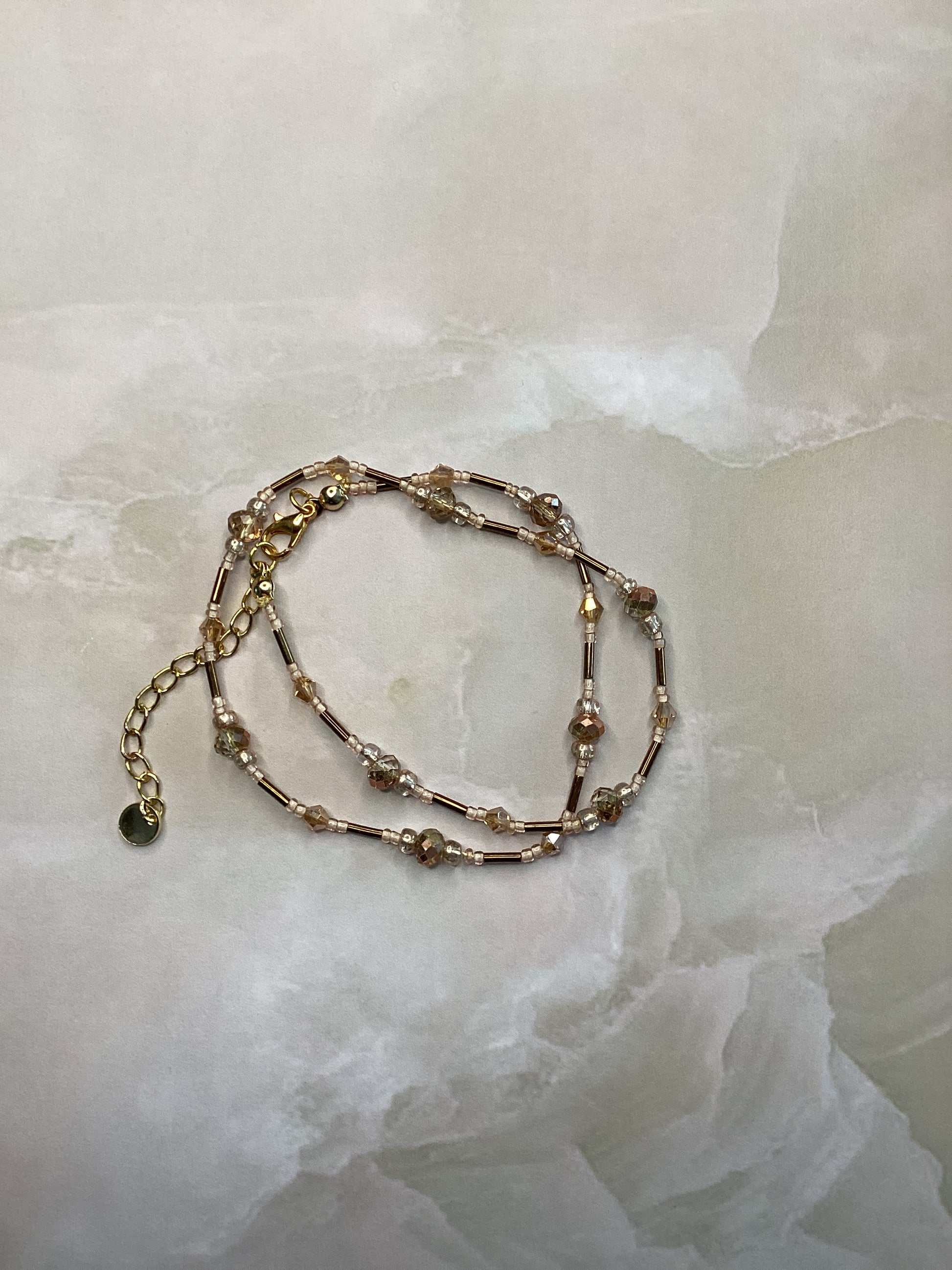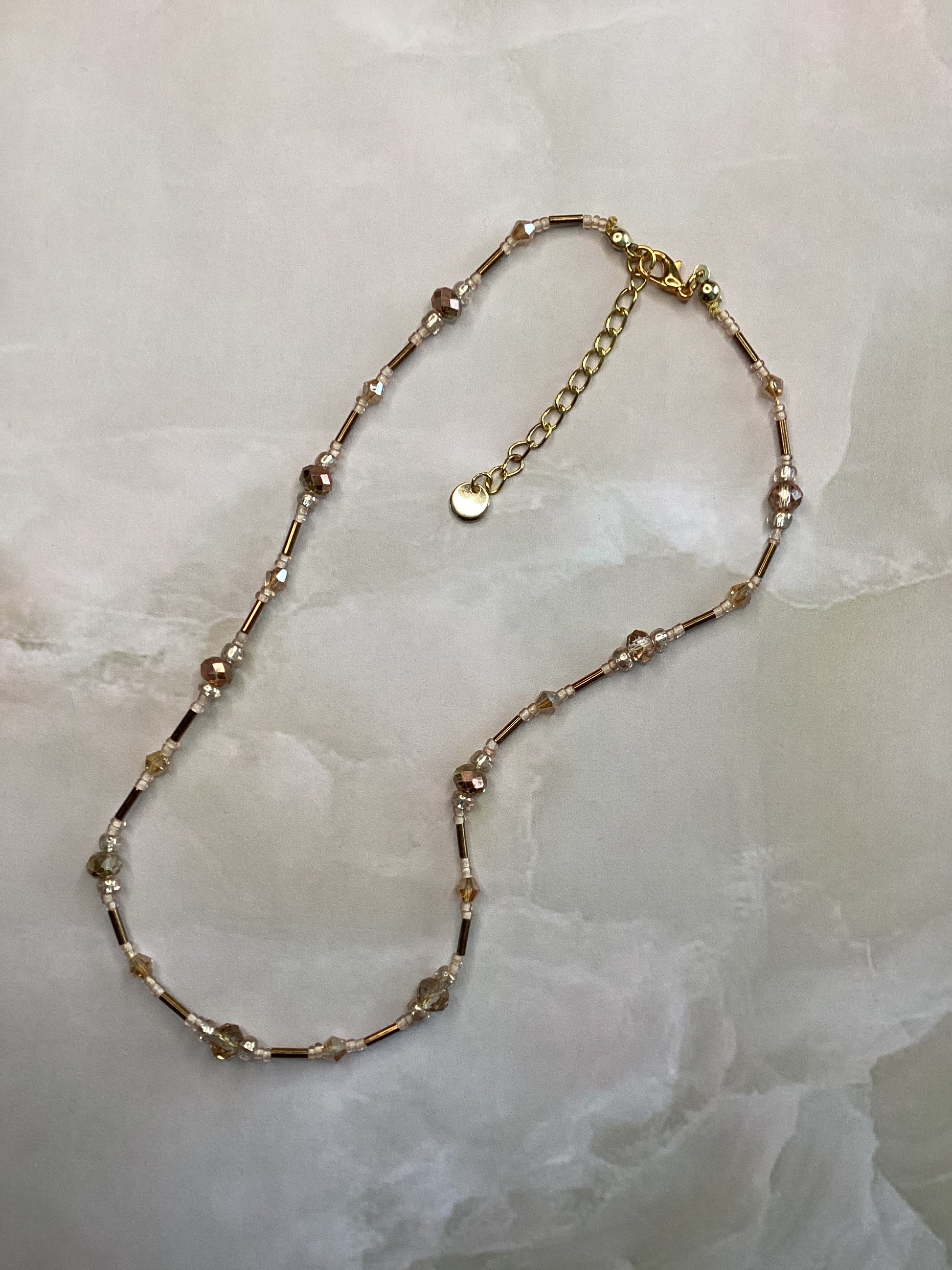Sehr elegante Halskette in Farbe Gold / beige die aus Glasschliff ,rocalles und Stiftperlen gefertigt wurde.die Länge beträgt 42 cm + 5 cm Verlängerungs Kettchen .