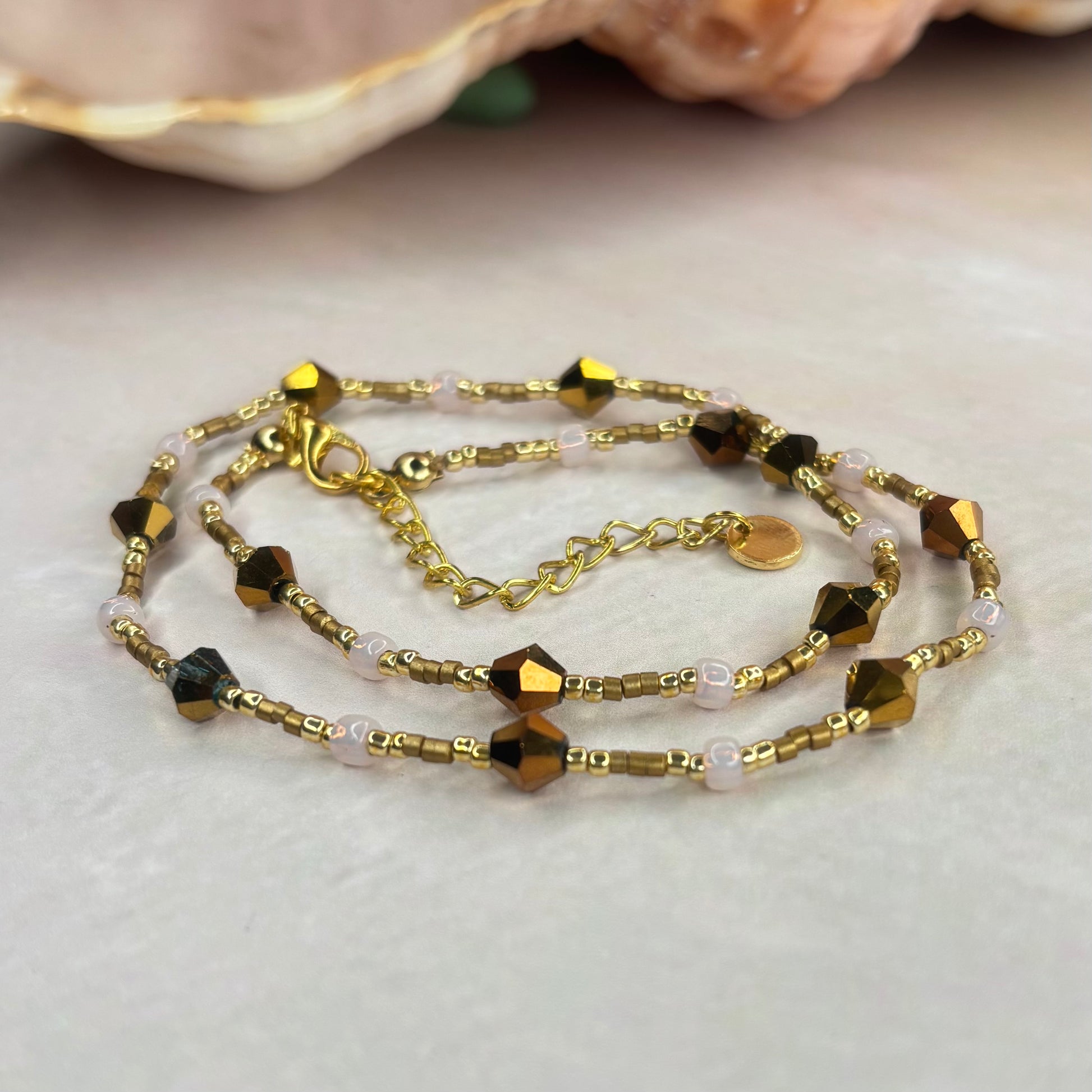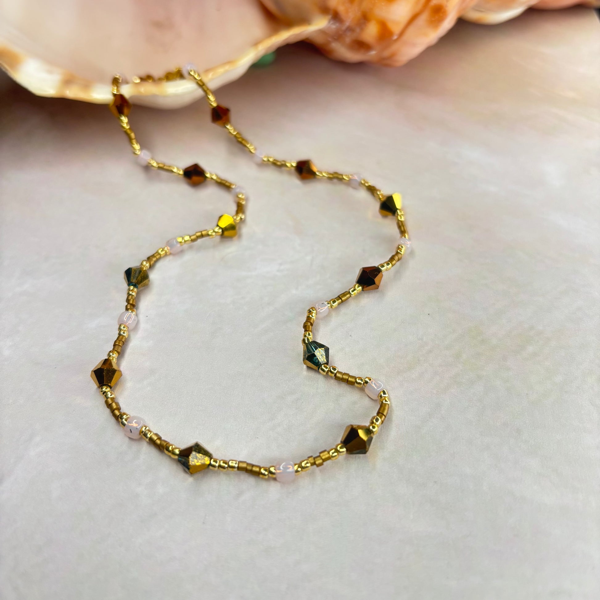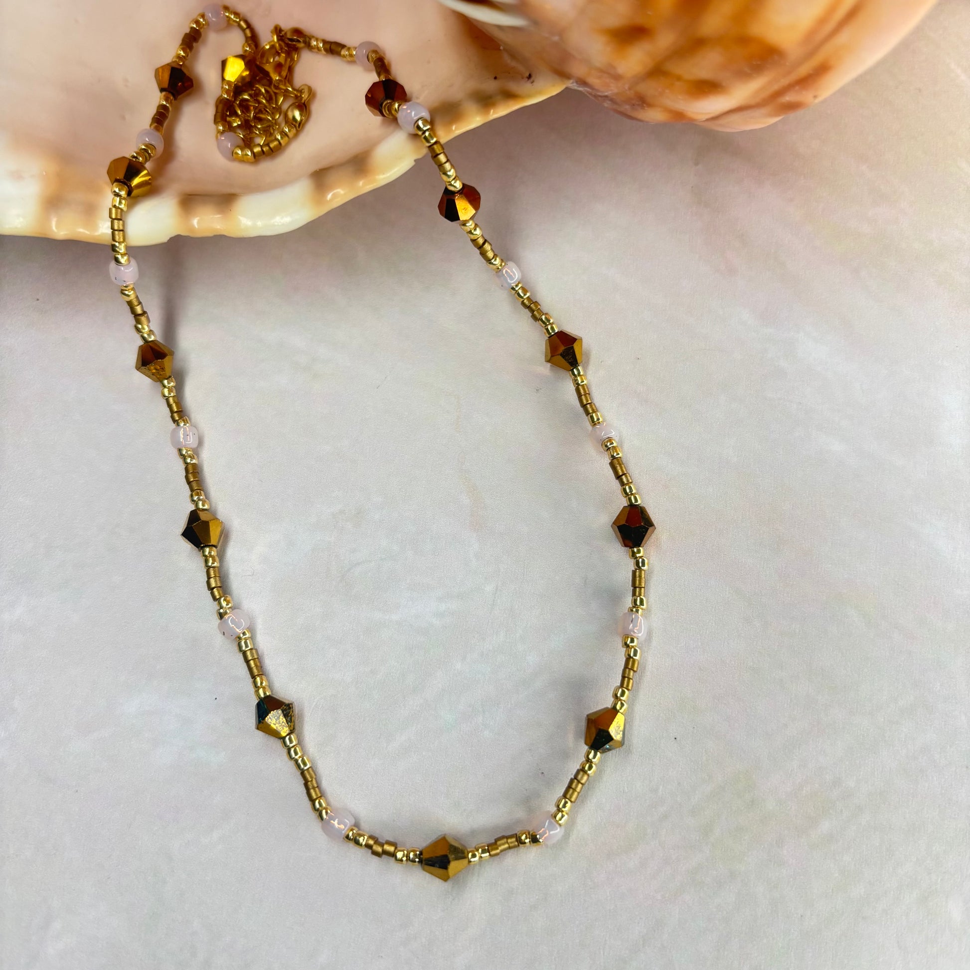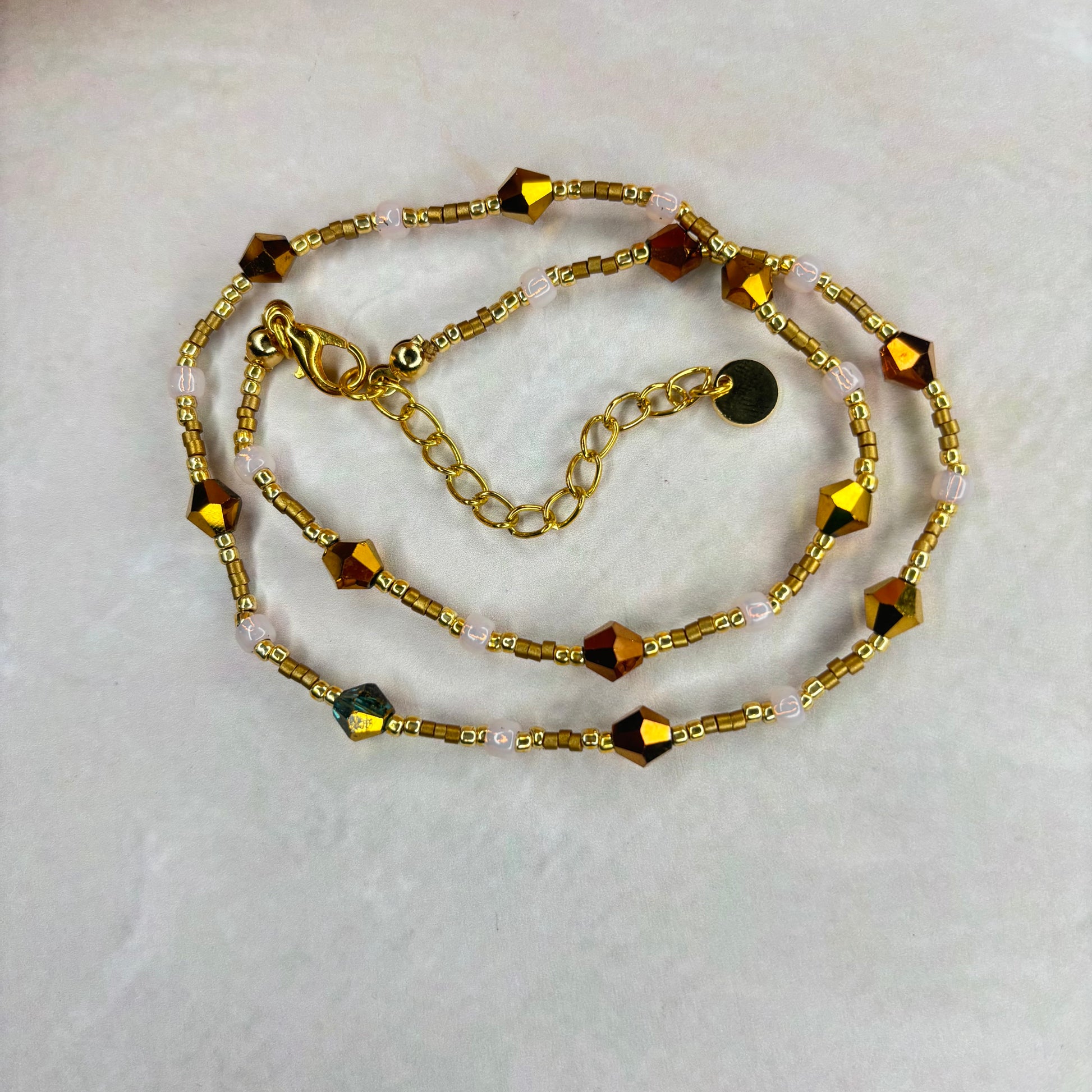 Eine sehr schöne Kette in der Farbe Gold aus Glasschliff Perlen und rocalles.Die Länge beträgt 40 cm und 5 cm Verlängerungs Kettchen.Eine sehr elegante Kette.