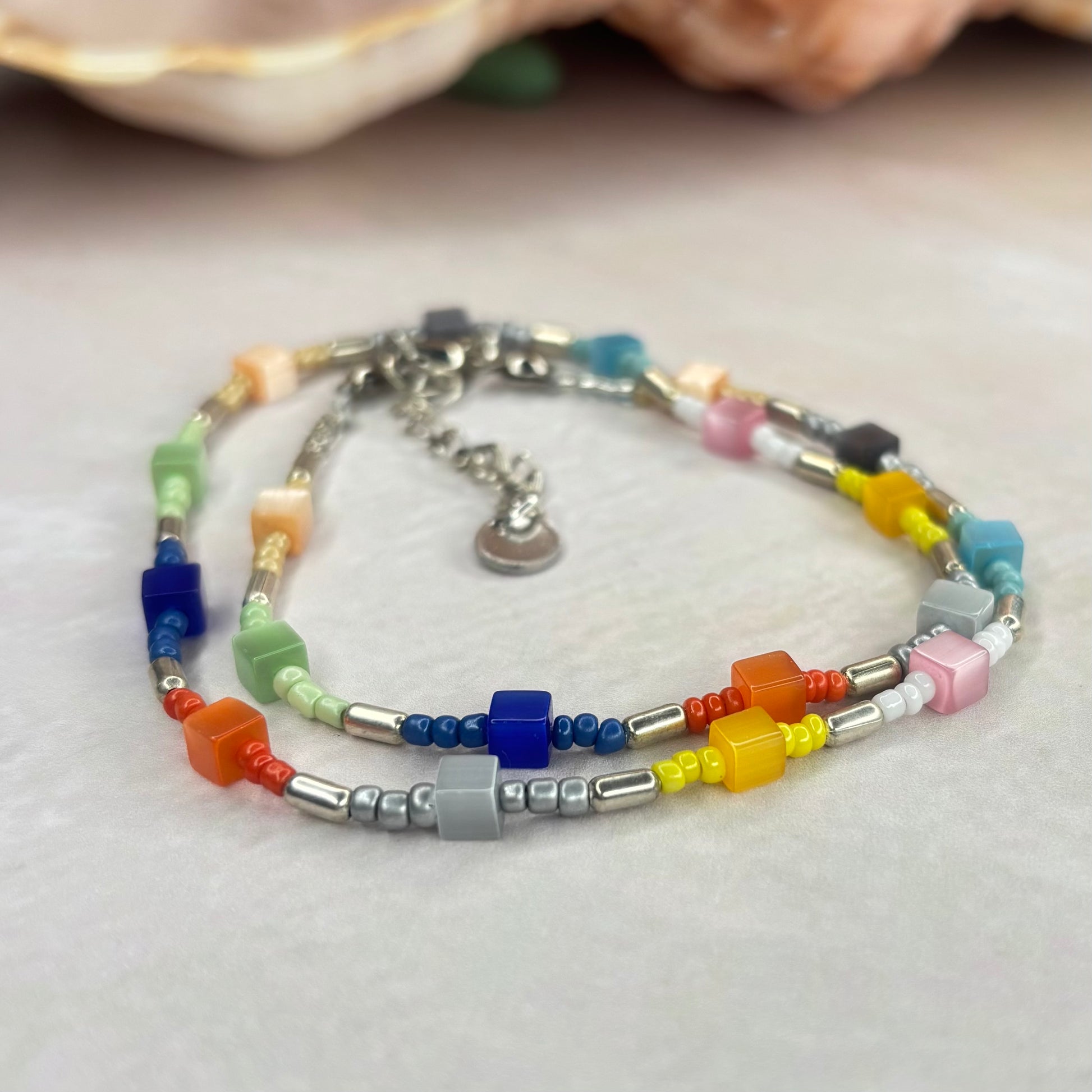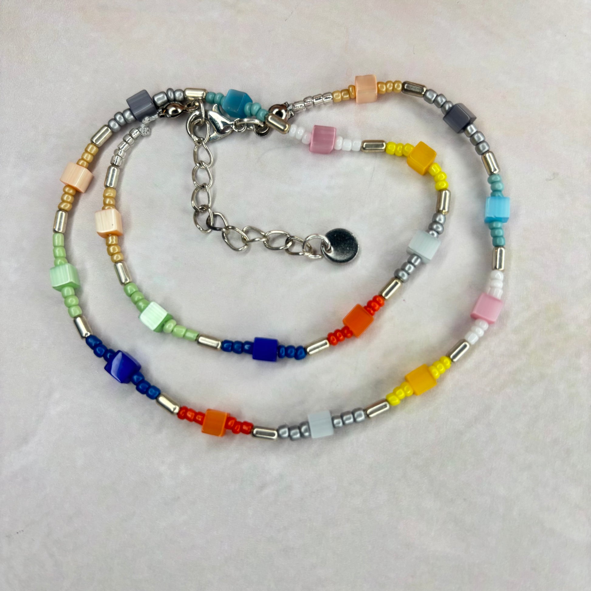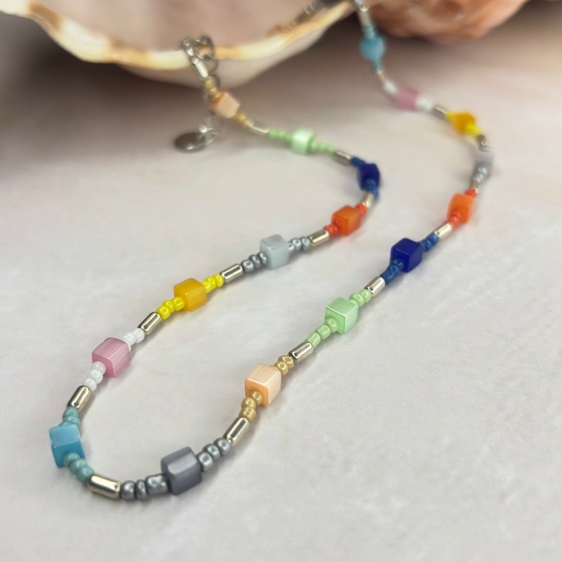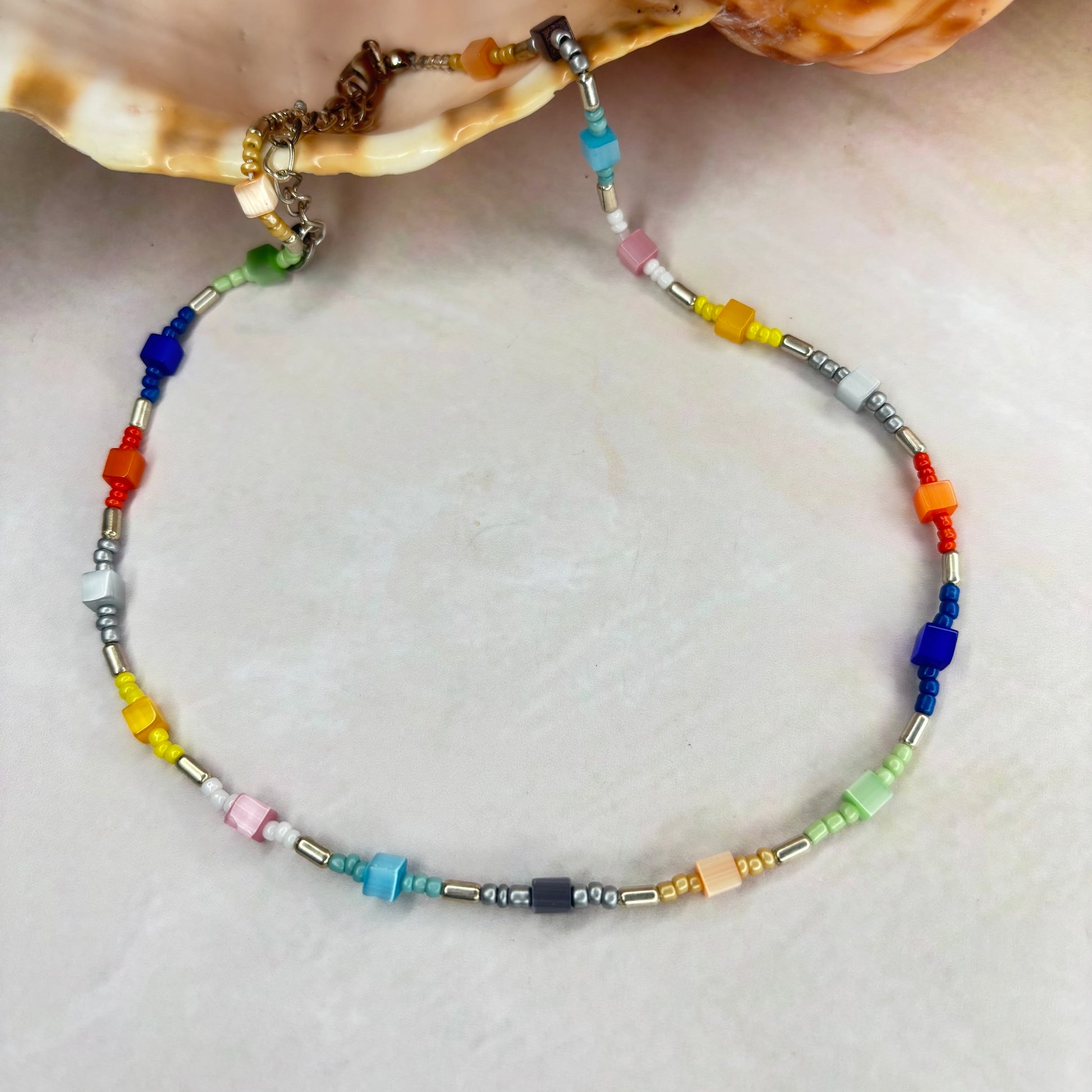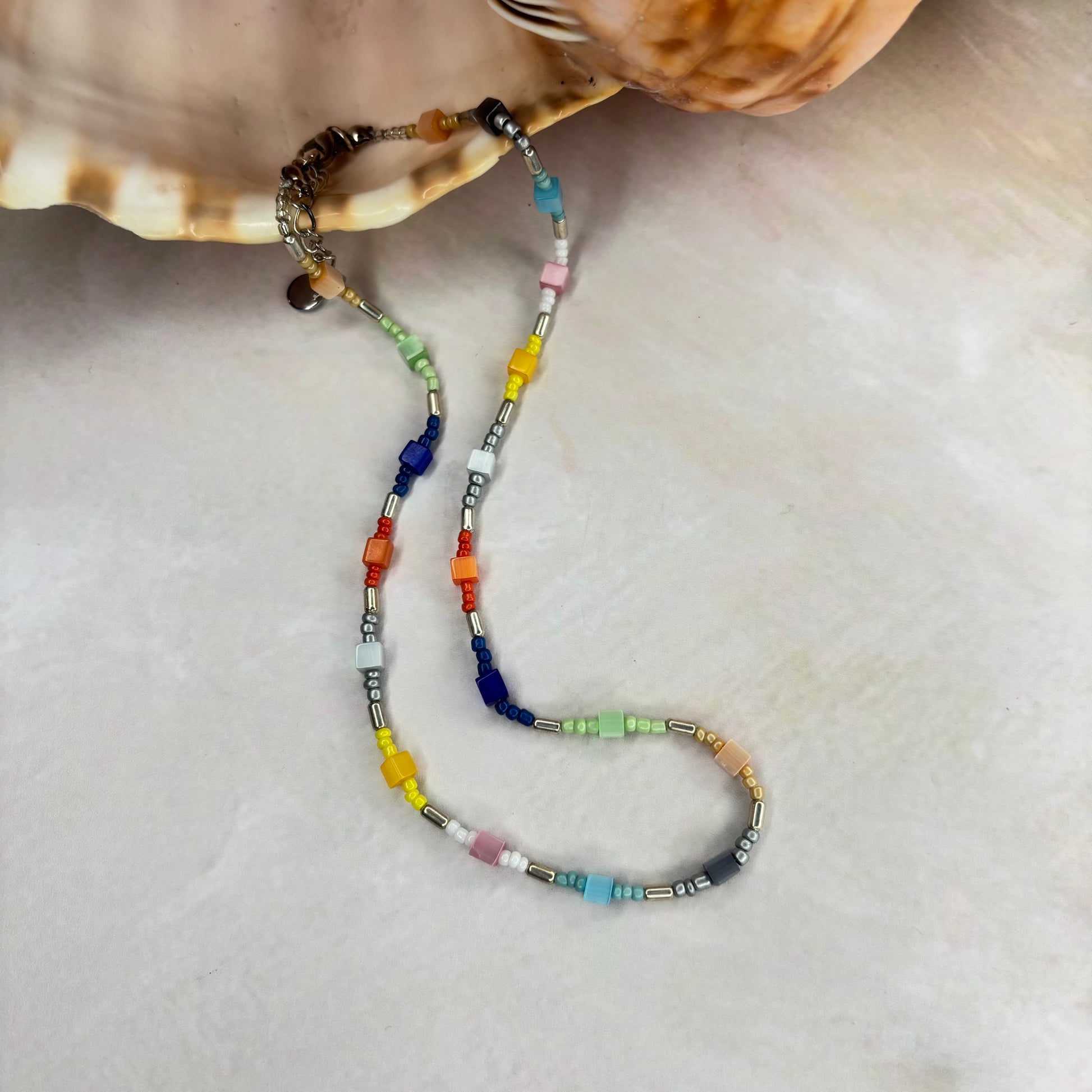 Eine sehr schöne Kette aus bunten Glasperlen und rocalles.Die Länge beträgt 41 cm und 5 cm Verlängerungs Kettchen. Eine Kette für jeden Anlass.