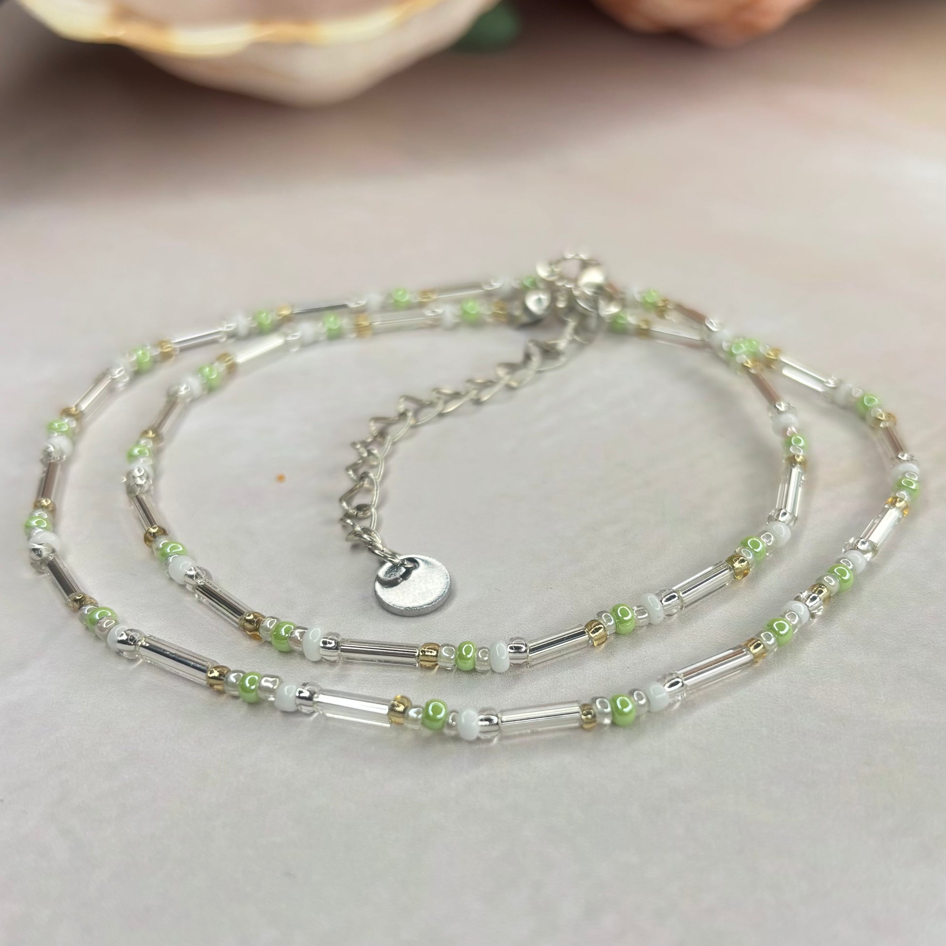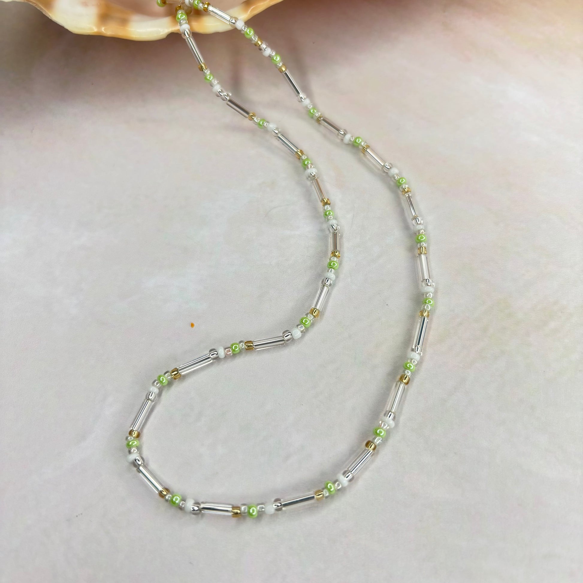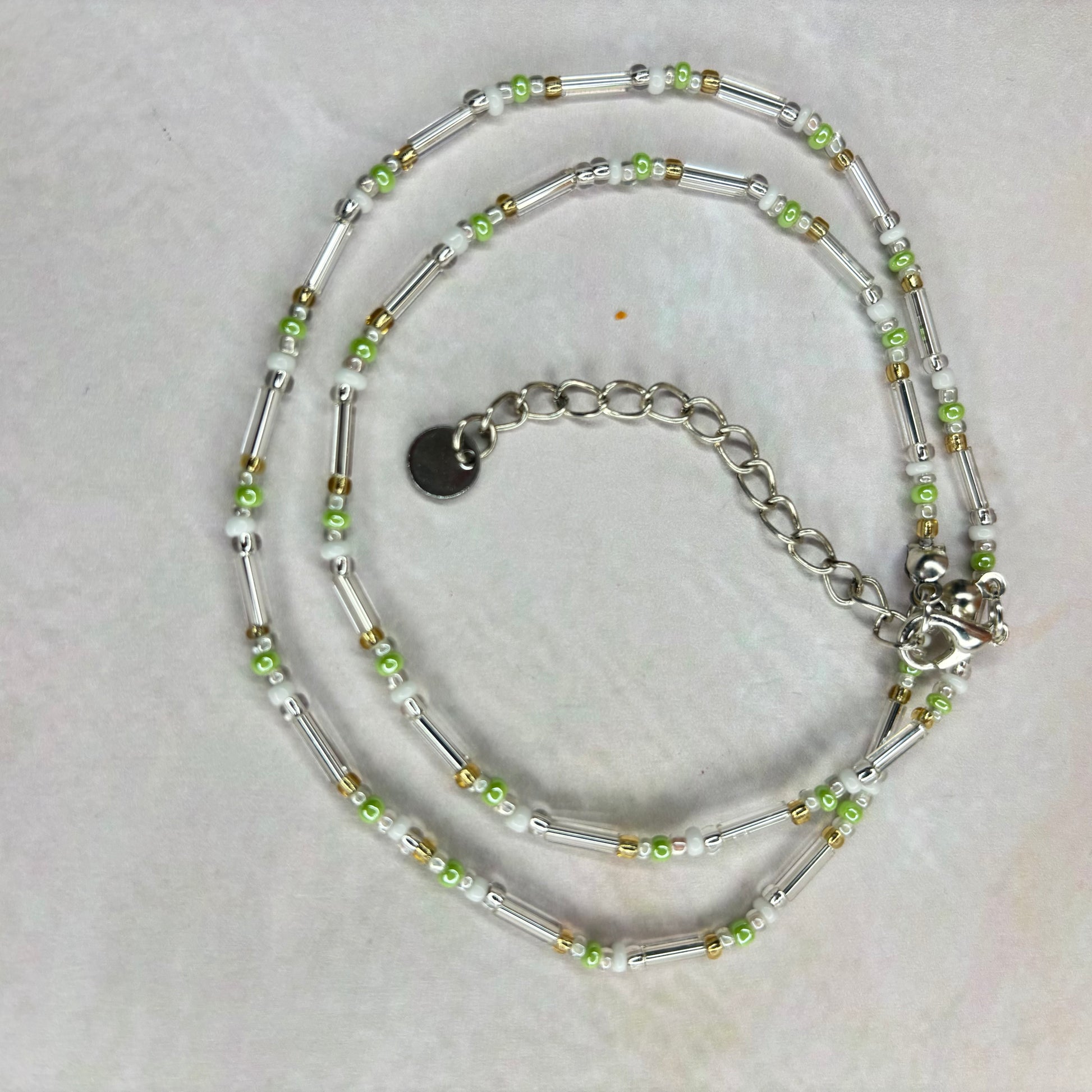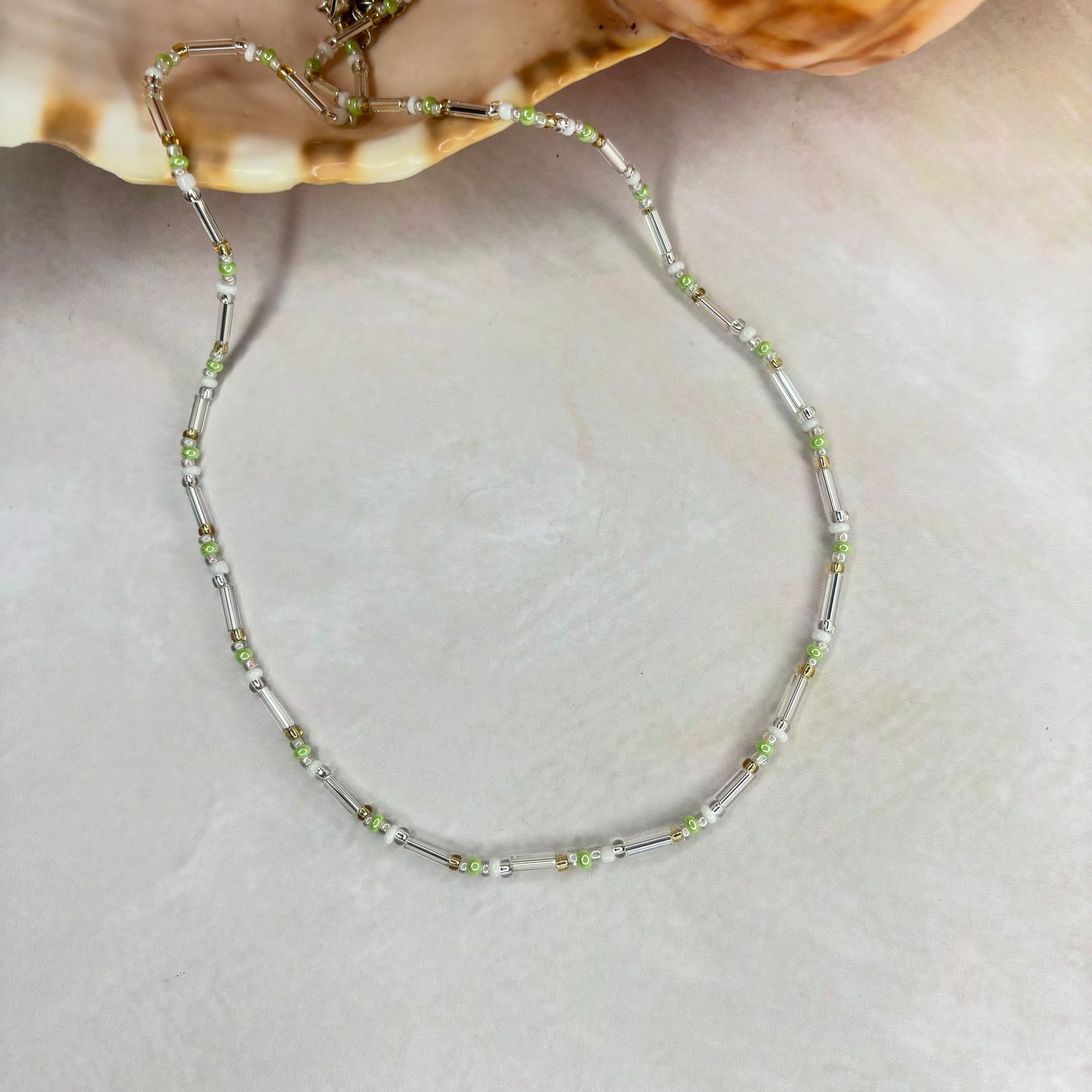 Eine schöne ,dezente Kette aus rocalles und Stift Perlen in der Farbe Silber / hellgrün / gold. Die Länge beträgt 47 cm und 5 cm Verlängerungs Kettchen.