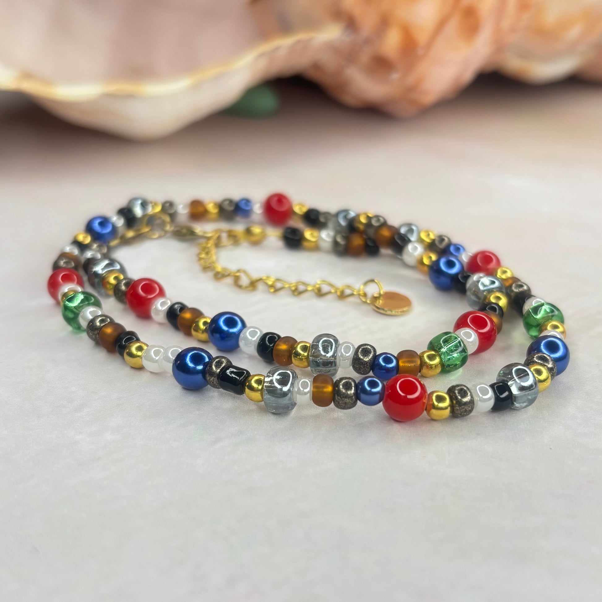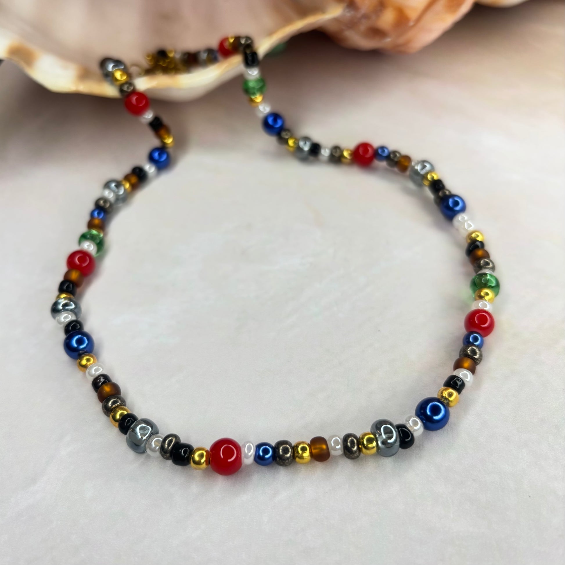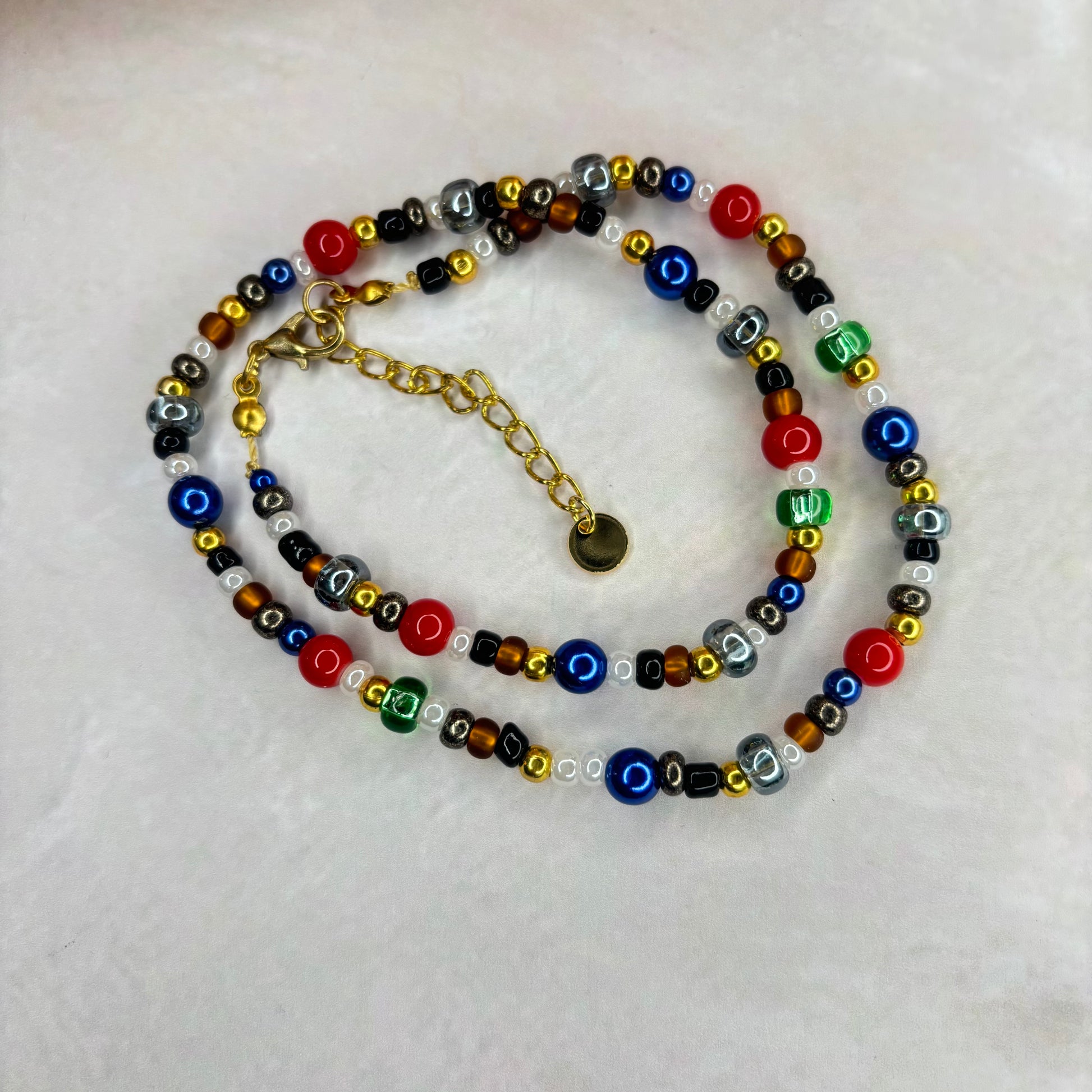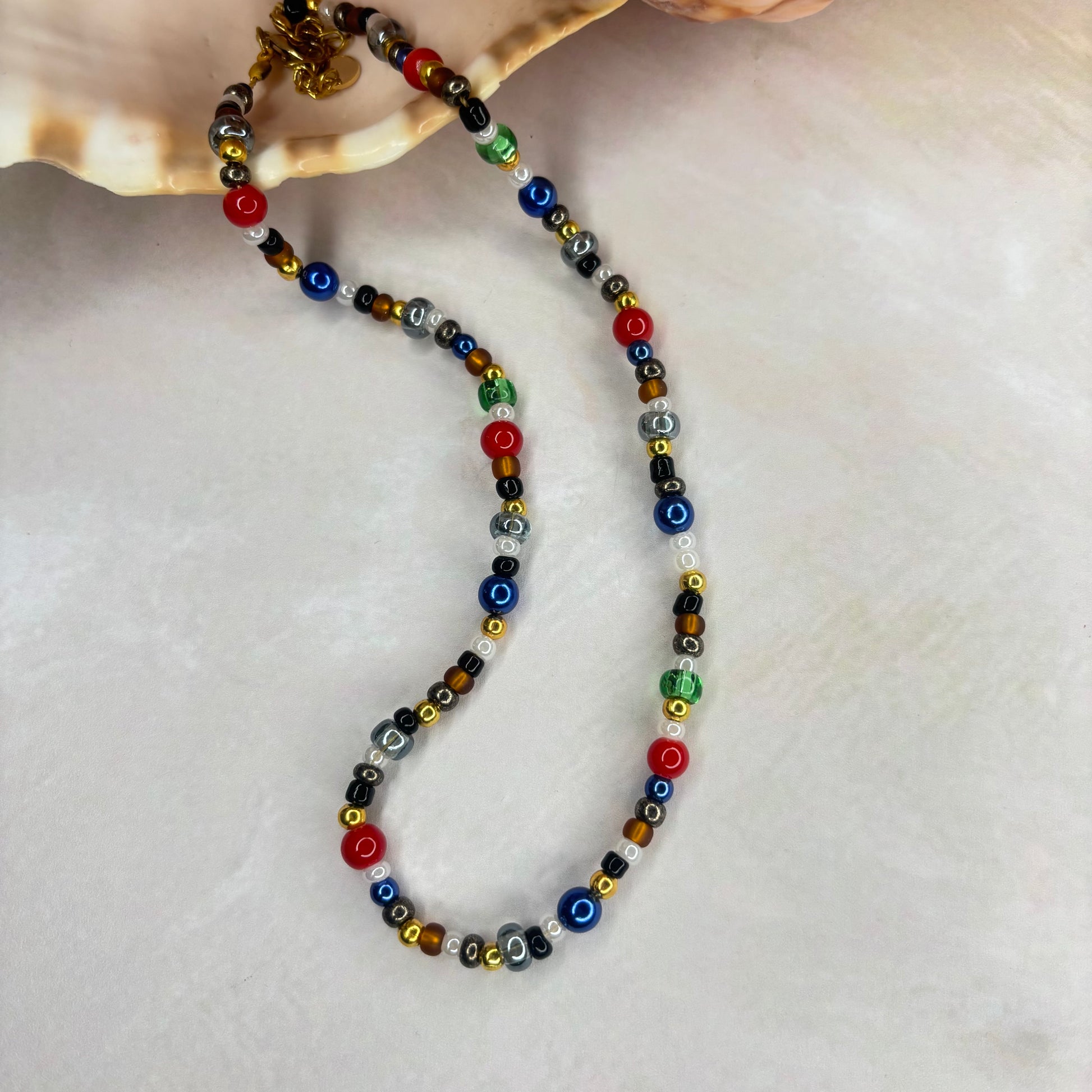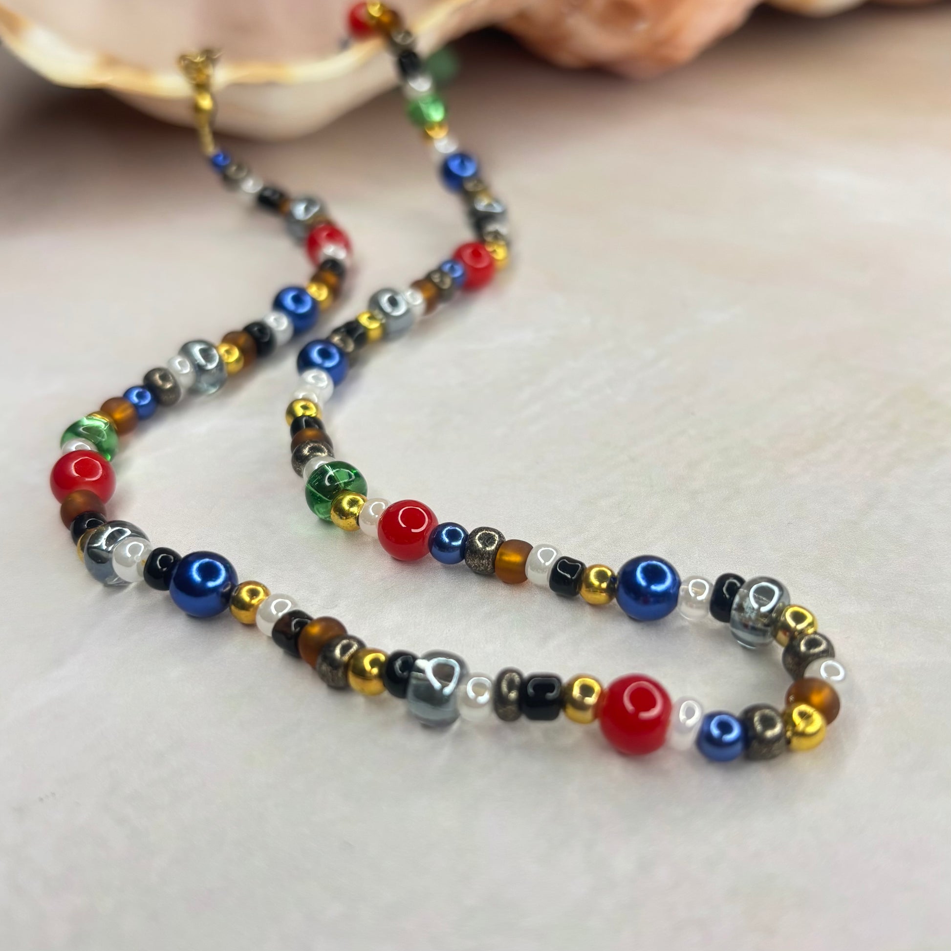 Eine schöne Kette aus bunten Glasperlen. Die Länge beträgt 42 cm und 5 cm Verlängerungs Kettchen. Eine Kette für jeden Tag.