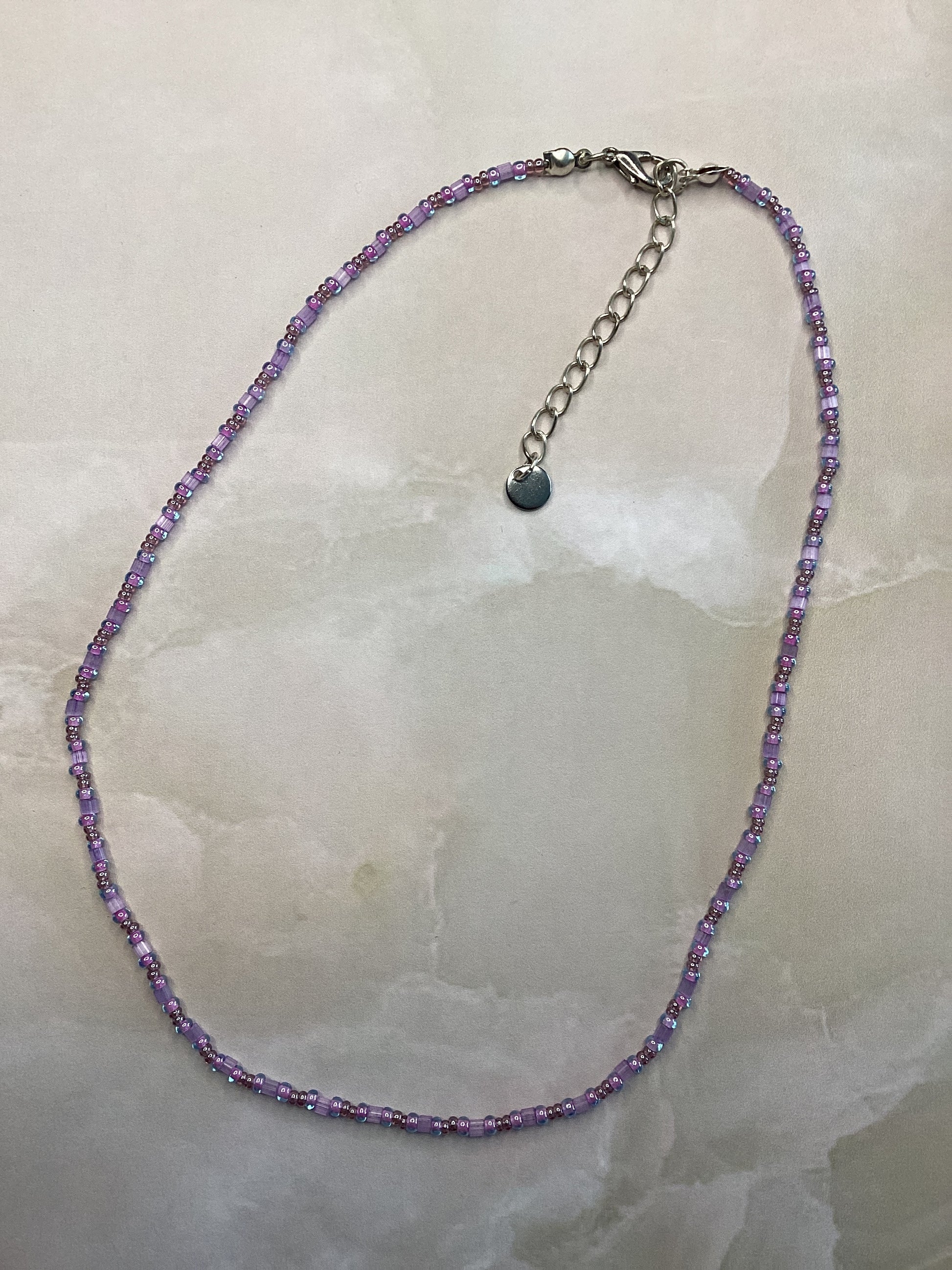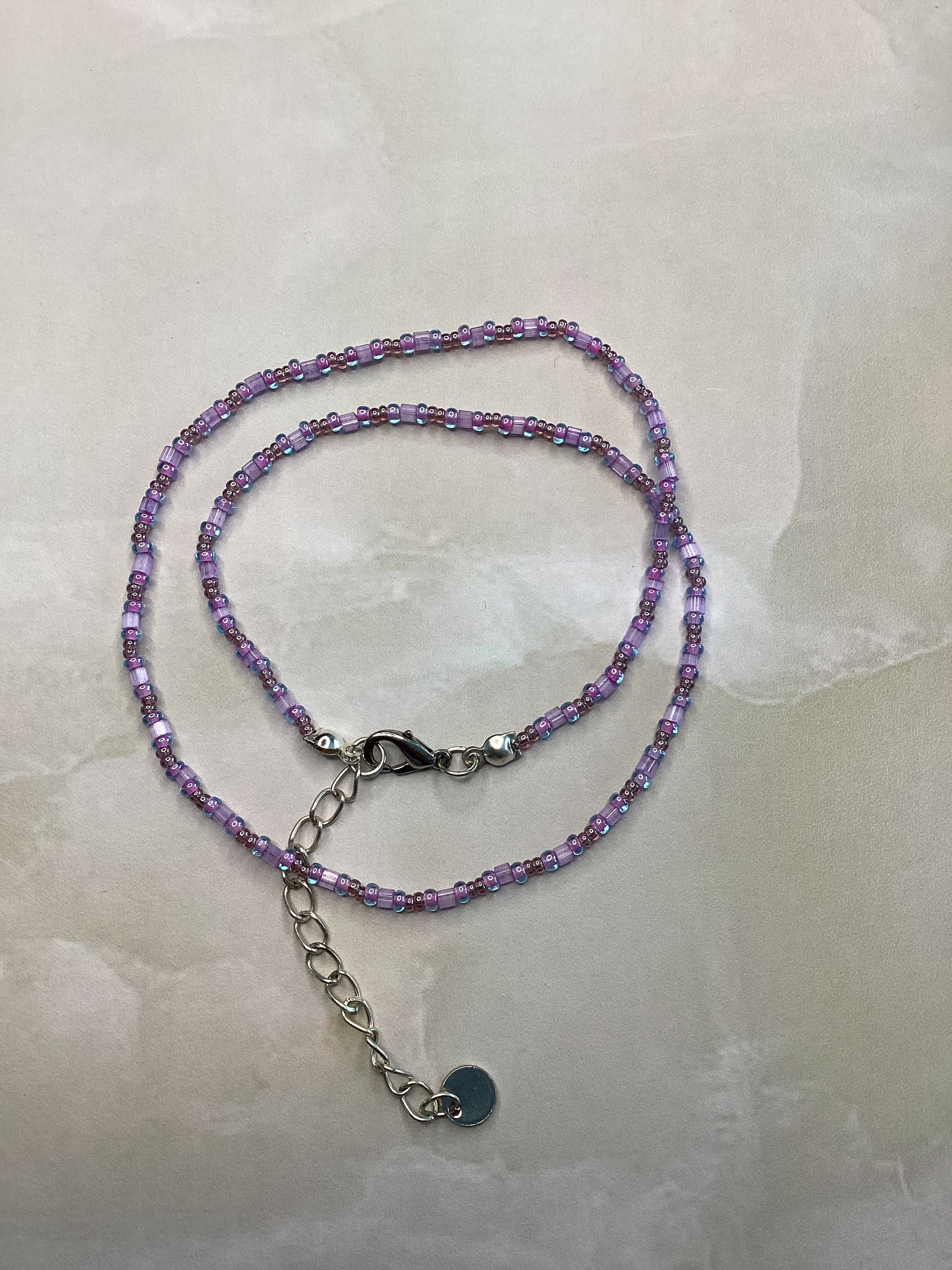 Eine sehr filigrane Halskette in Farbe lila.Sie ist 42 cm lang und hat eine 5 cm lange Verlängerungs Kettchen.Ein Schmuckstück für jeden Tag.