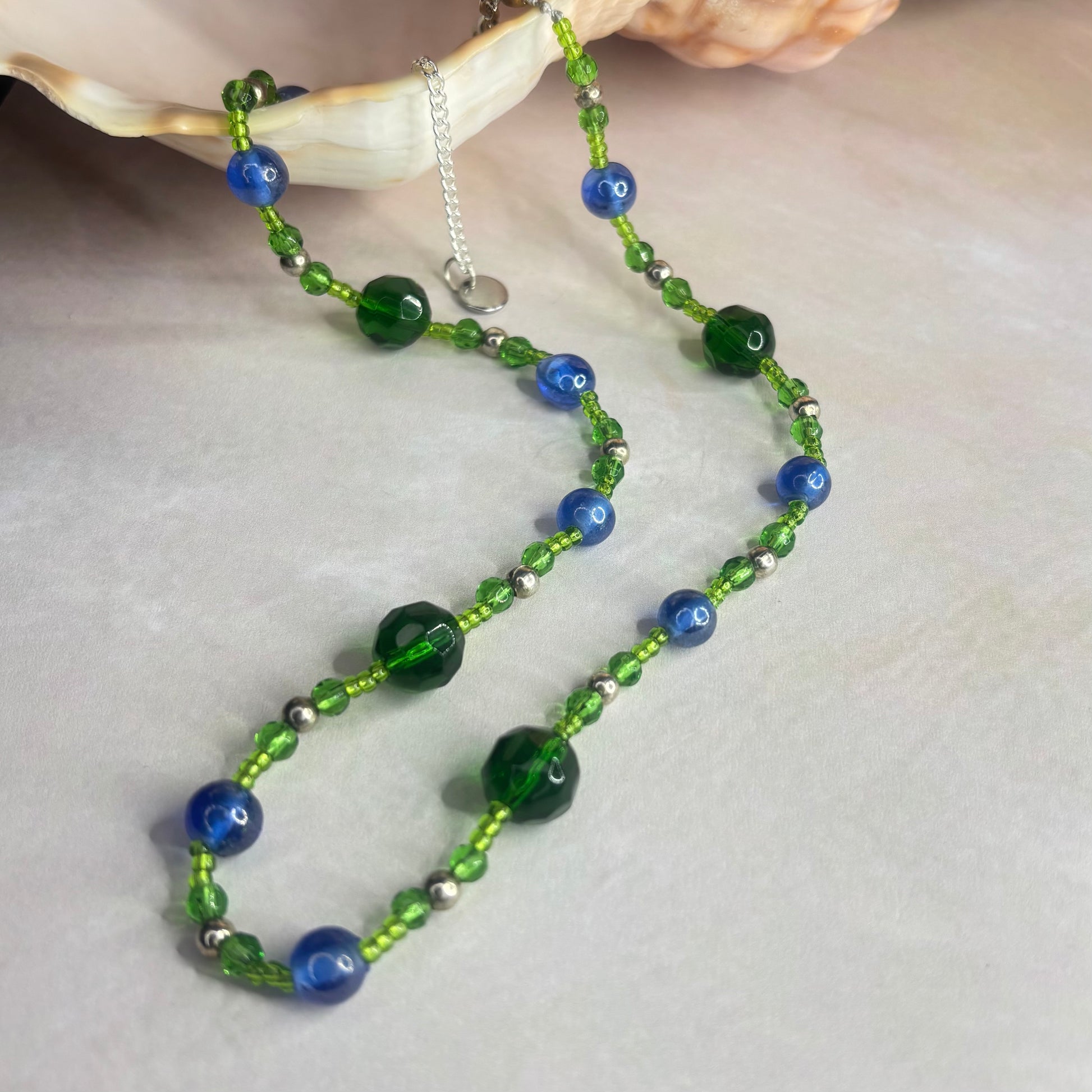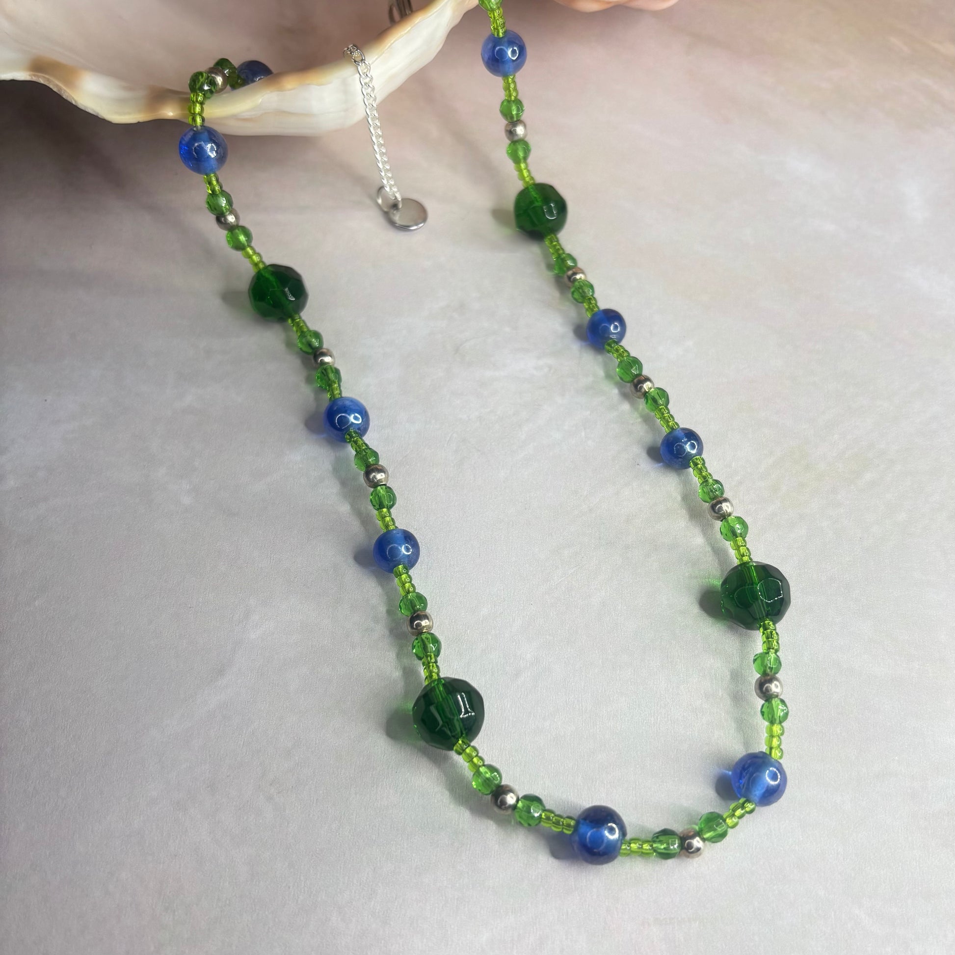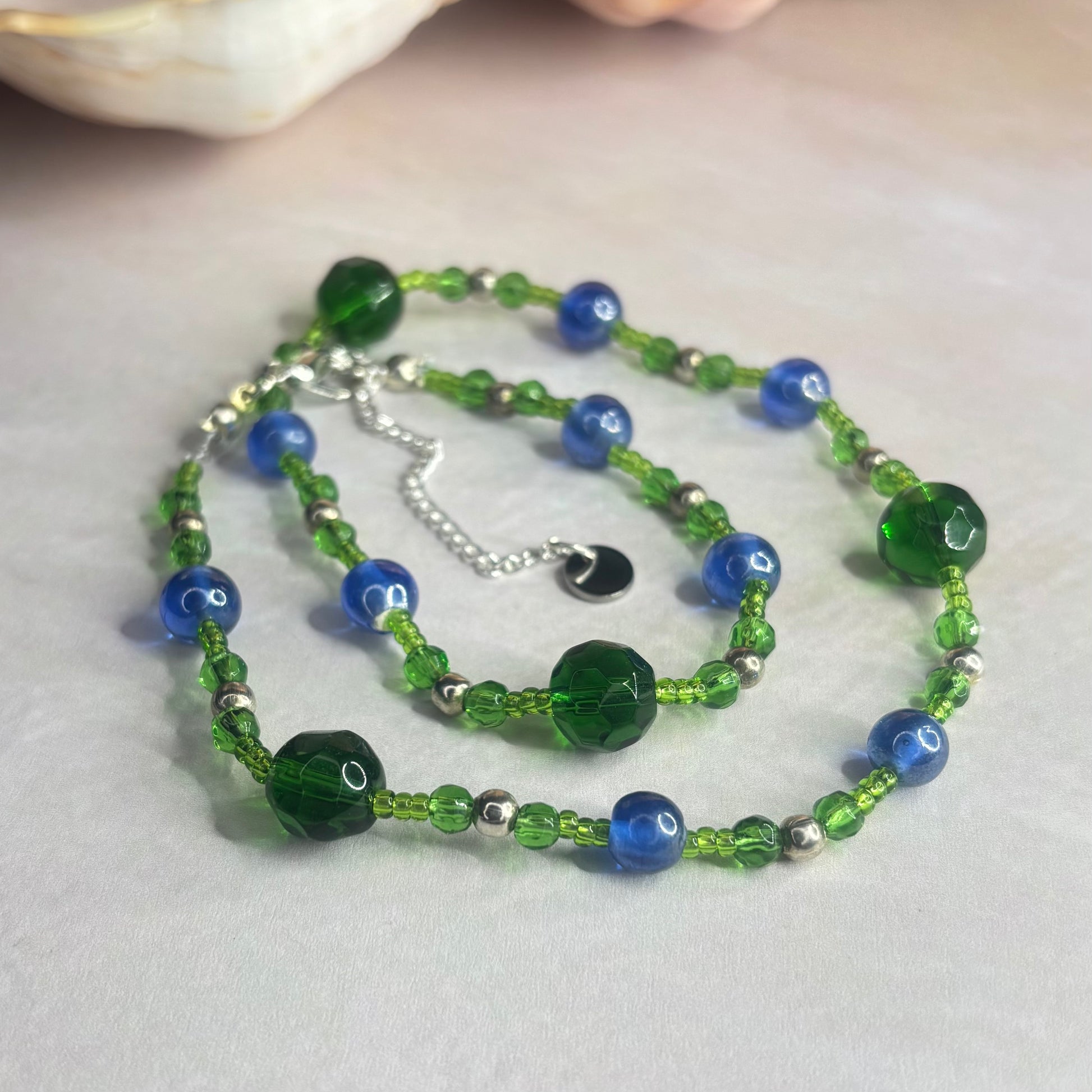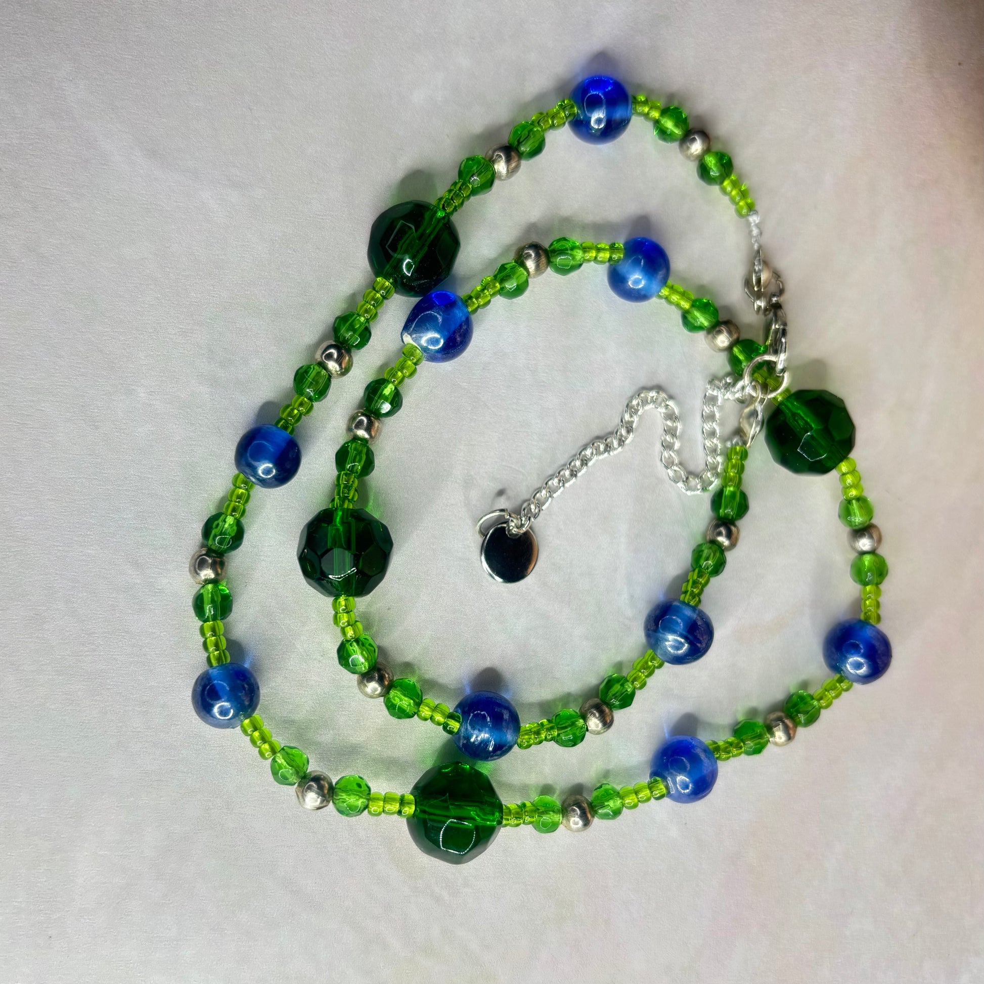 Eine sehr schöne Kette in der Farbe blau / grün aus Glasperlen und rocalles. Die Kette ist 41 cm lang und 6 cm Verlängerungs Kettchen.