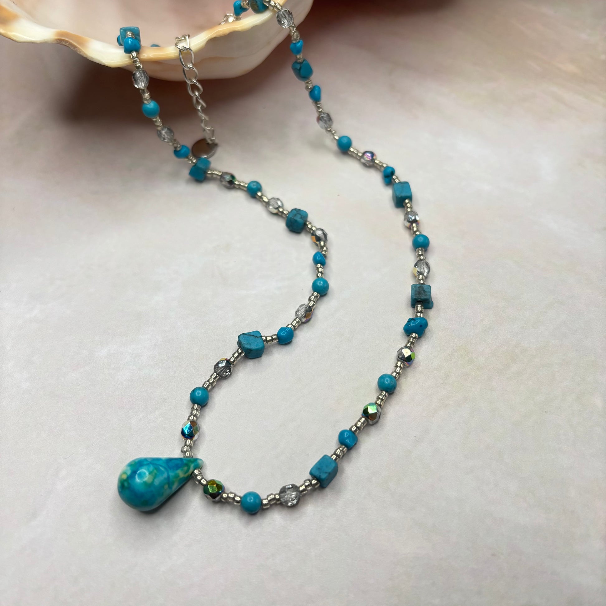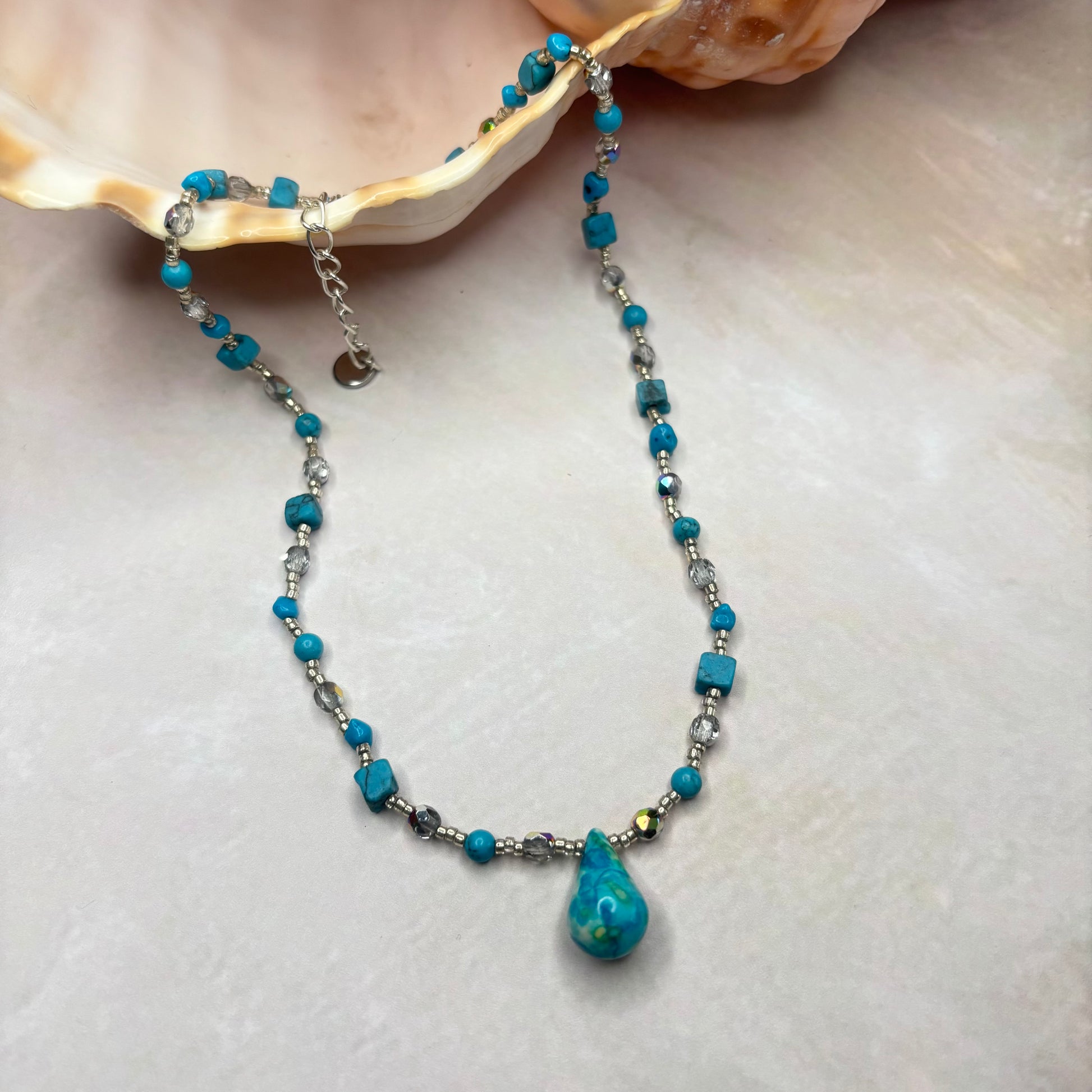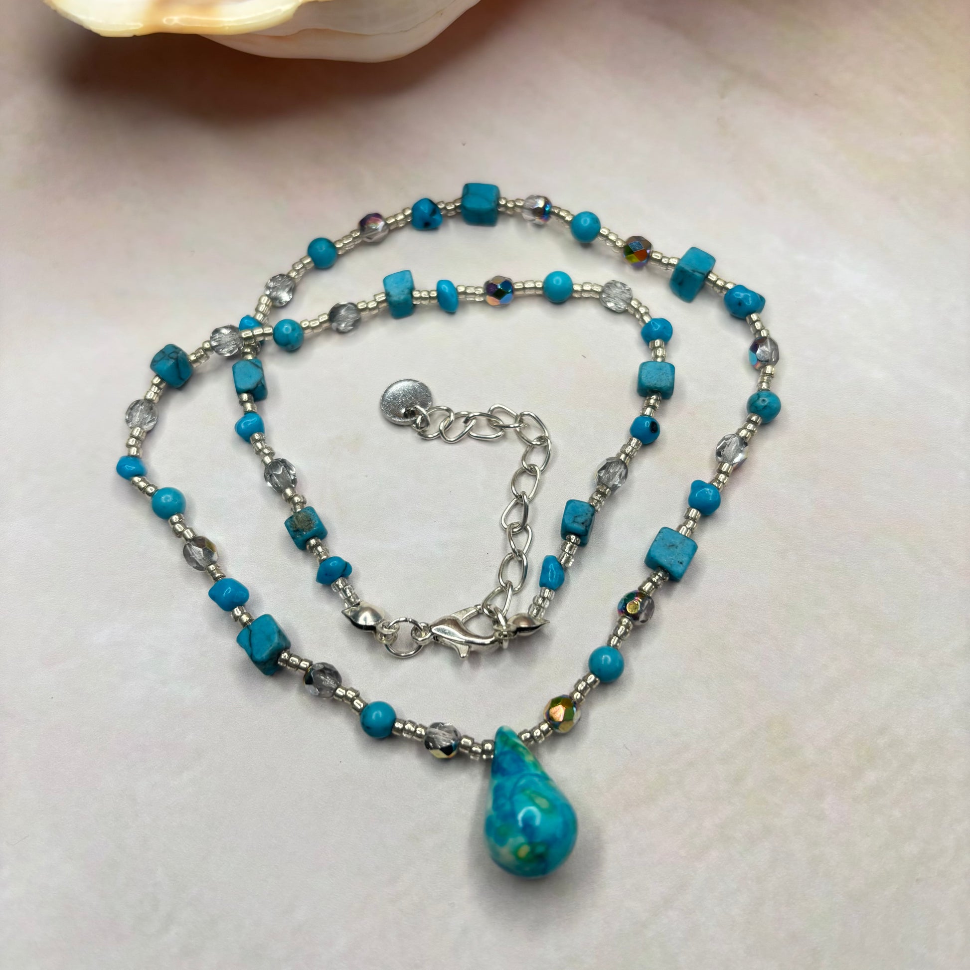 Sehr schöne Damen Halskette aus Howlith Edelsteine ,Glasschliff Perlen und rocalles in der Farbe türkis/silber.Die Länge beträgt 42 cm und 5 cm Verlängerungs Kettchen.