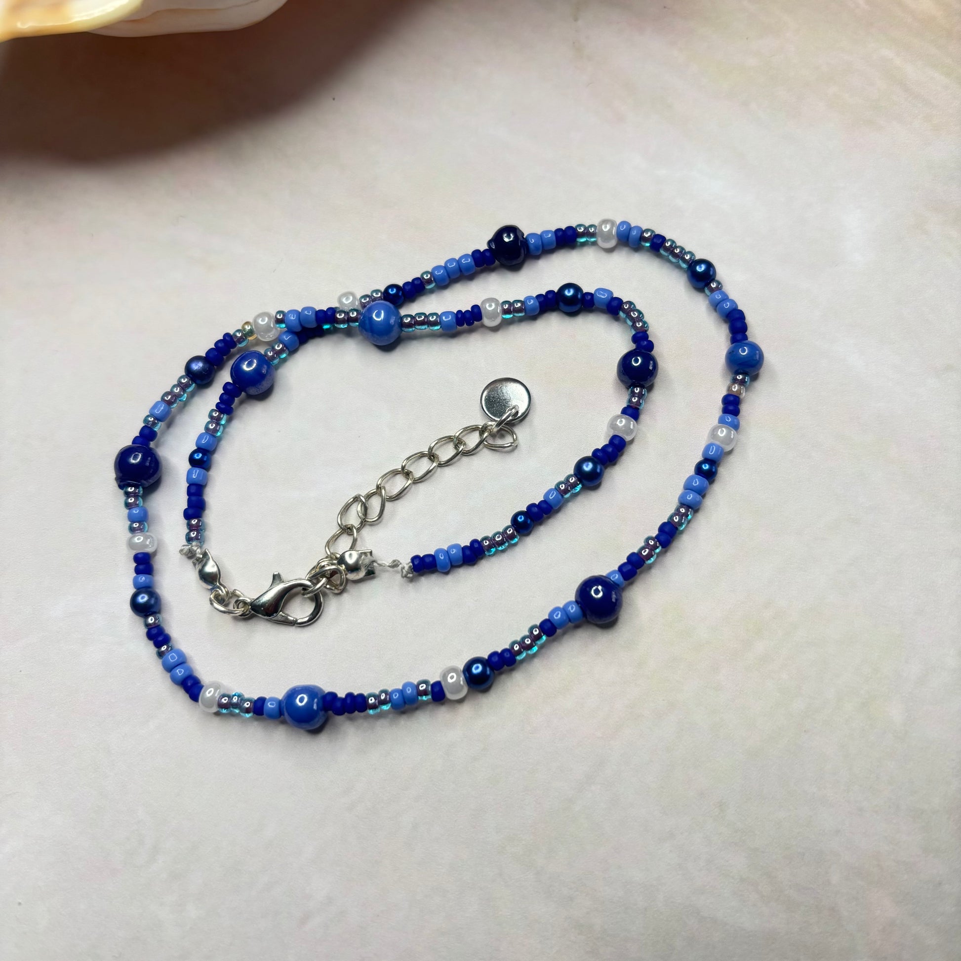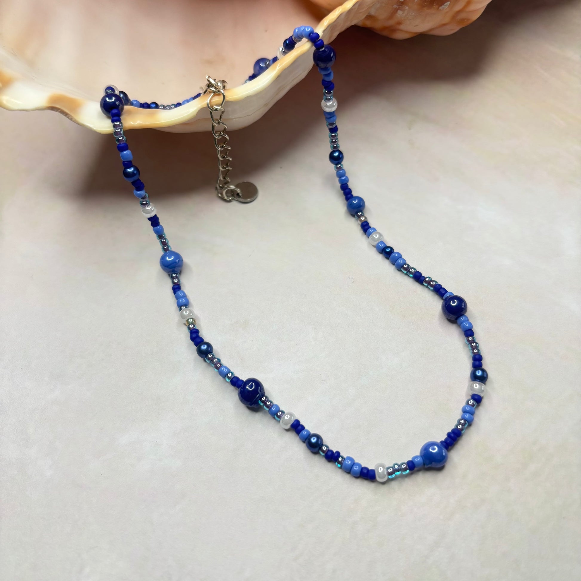 Sehr schöne Halskette aus Glasperlen und rocalles in der Farbe blau/ weiß.Die Länge beträgt 41 cm mit 5 cm Verlängerungs Kettchen.
