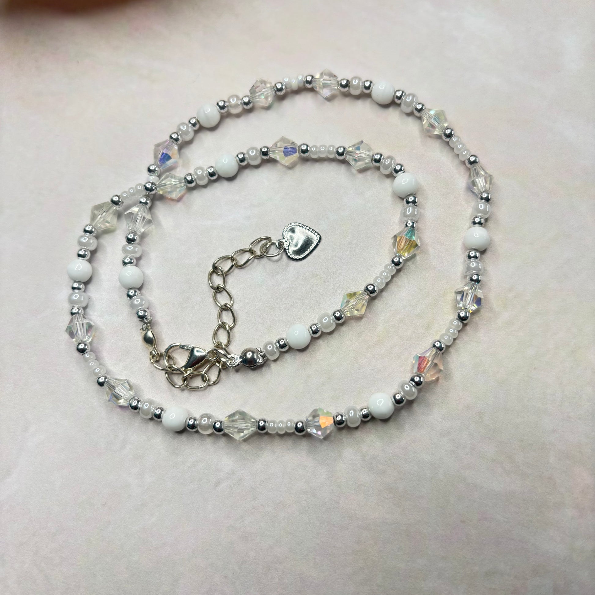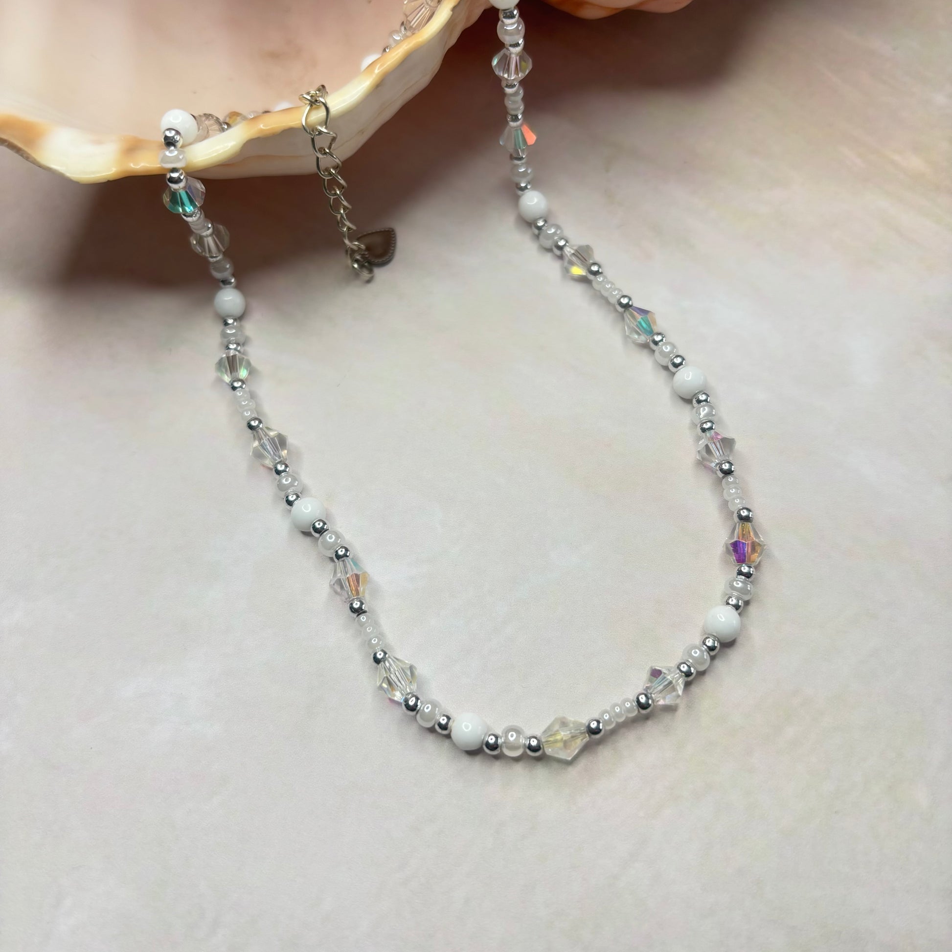 Eine sehr schöne Halskette aus Glasperlen,Glasschliff Perlen und rocalles in der Farbe Weiß/ Silber/AB klar .Die Kette ist 42 cm lang mit 5 cm Verlängerungs Kettchen.Eine Kette für jeden Anlass.