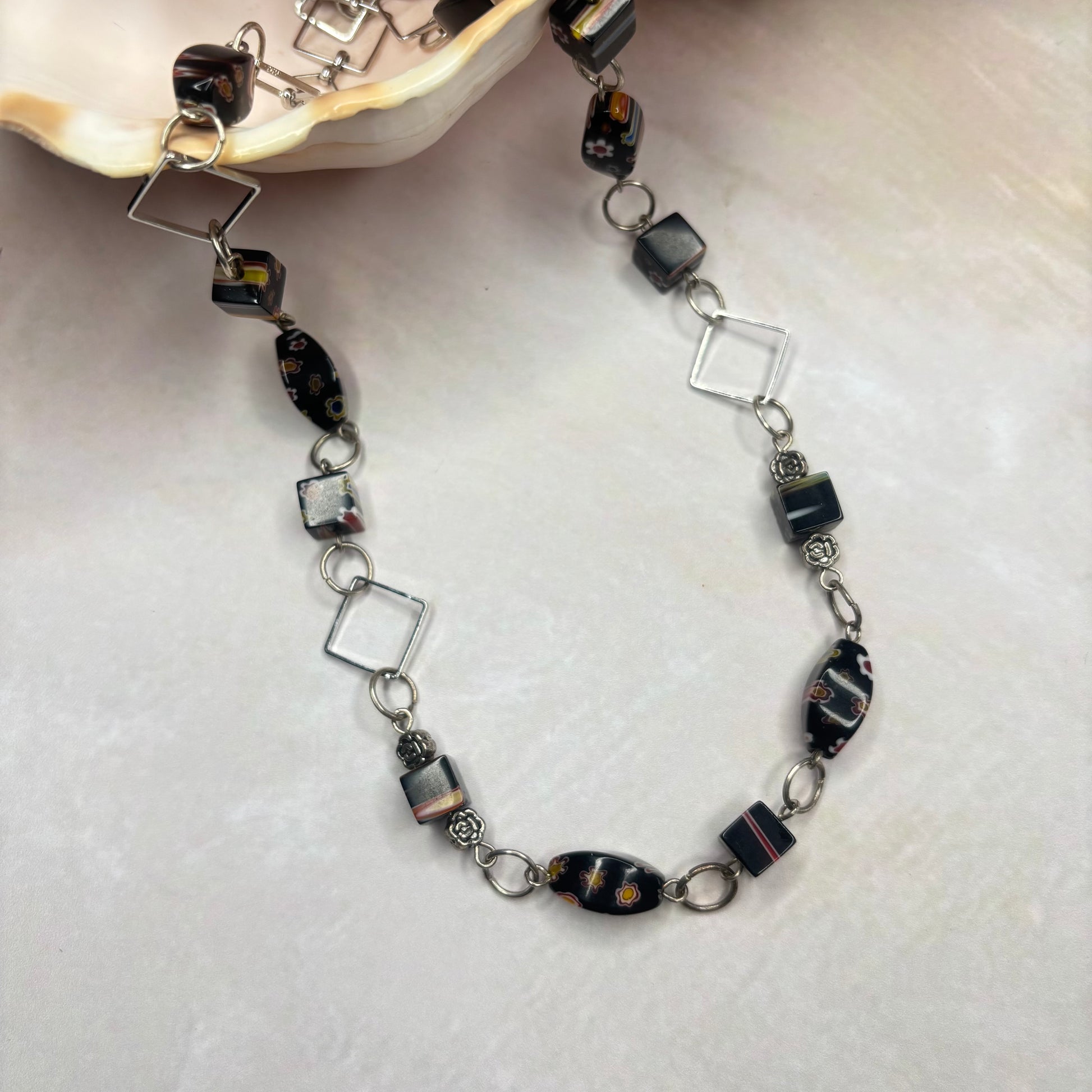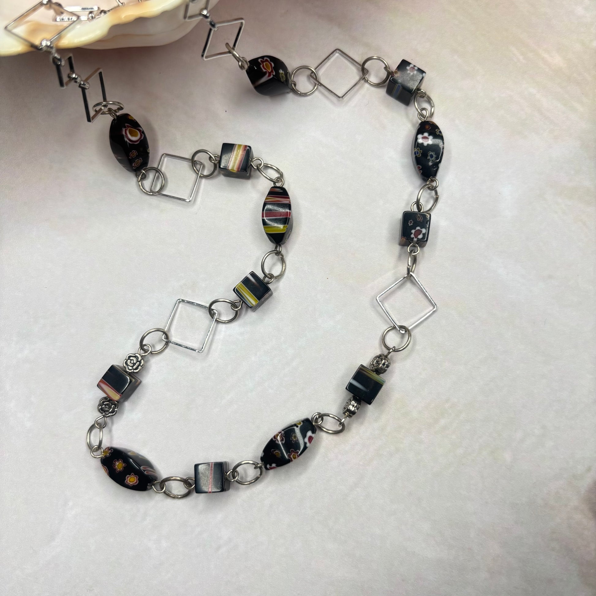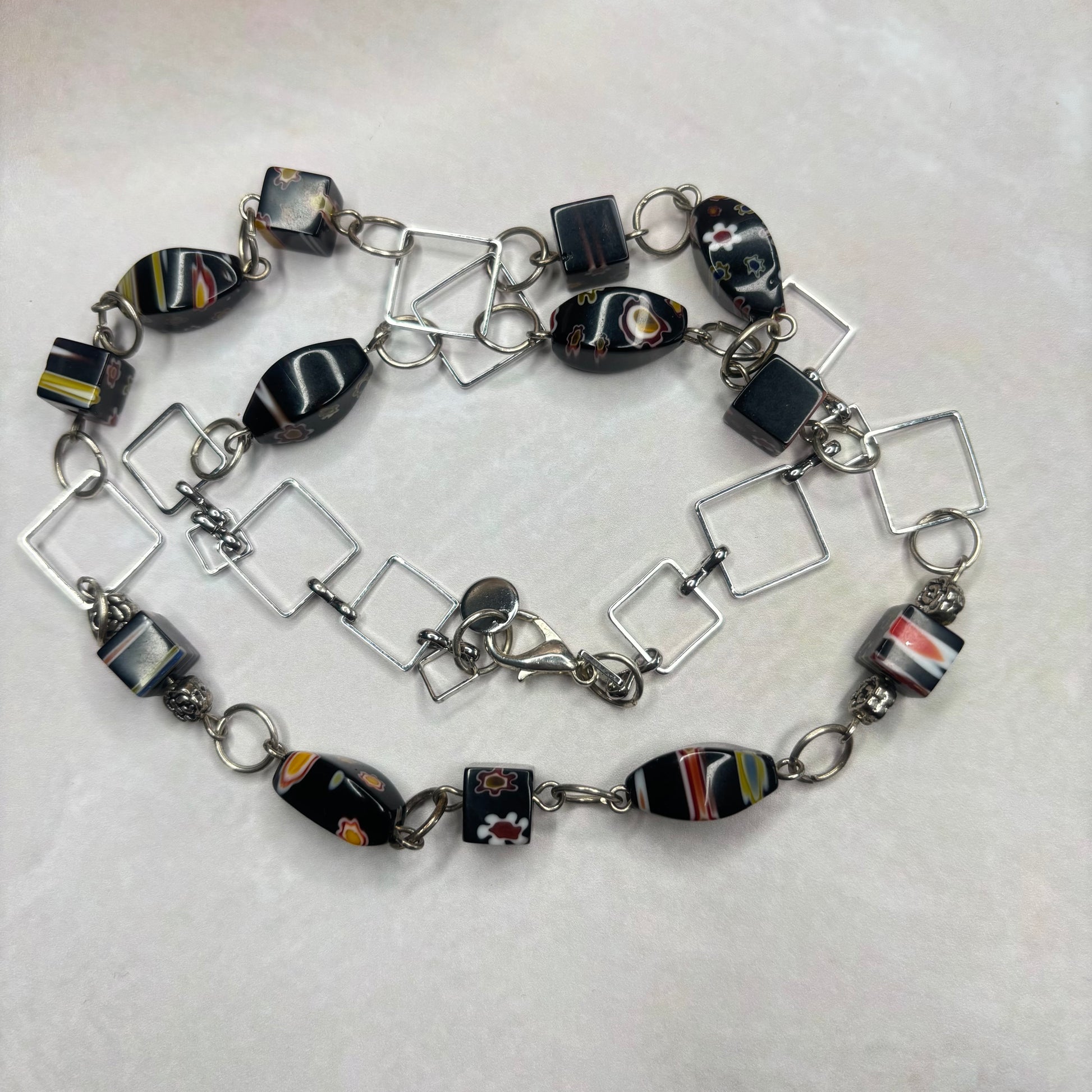 Eine schöne Kette aus gemusterten Glasperlen in der Länge 59 cm.