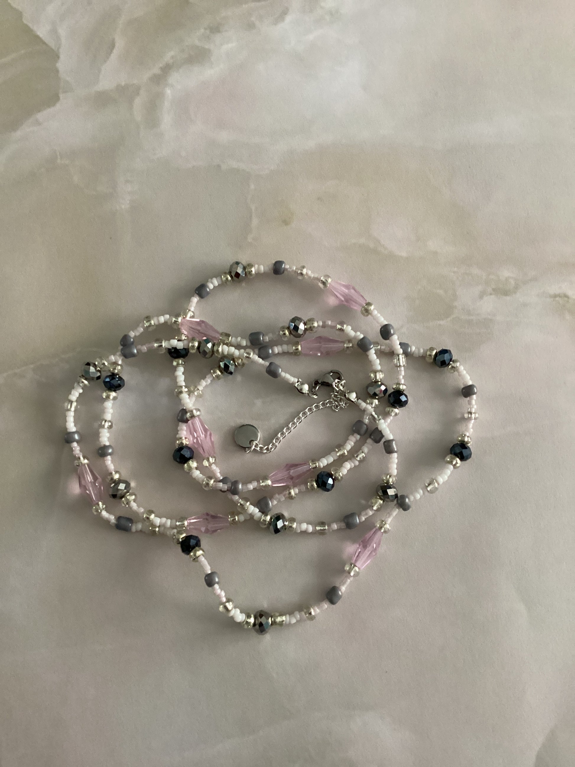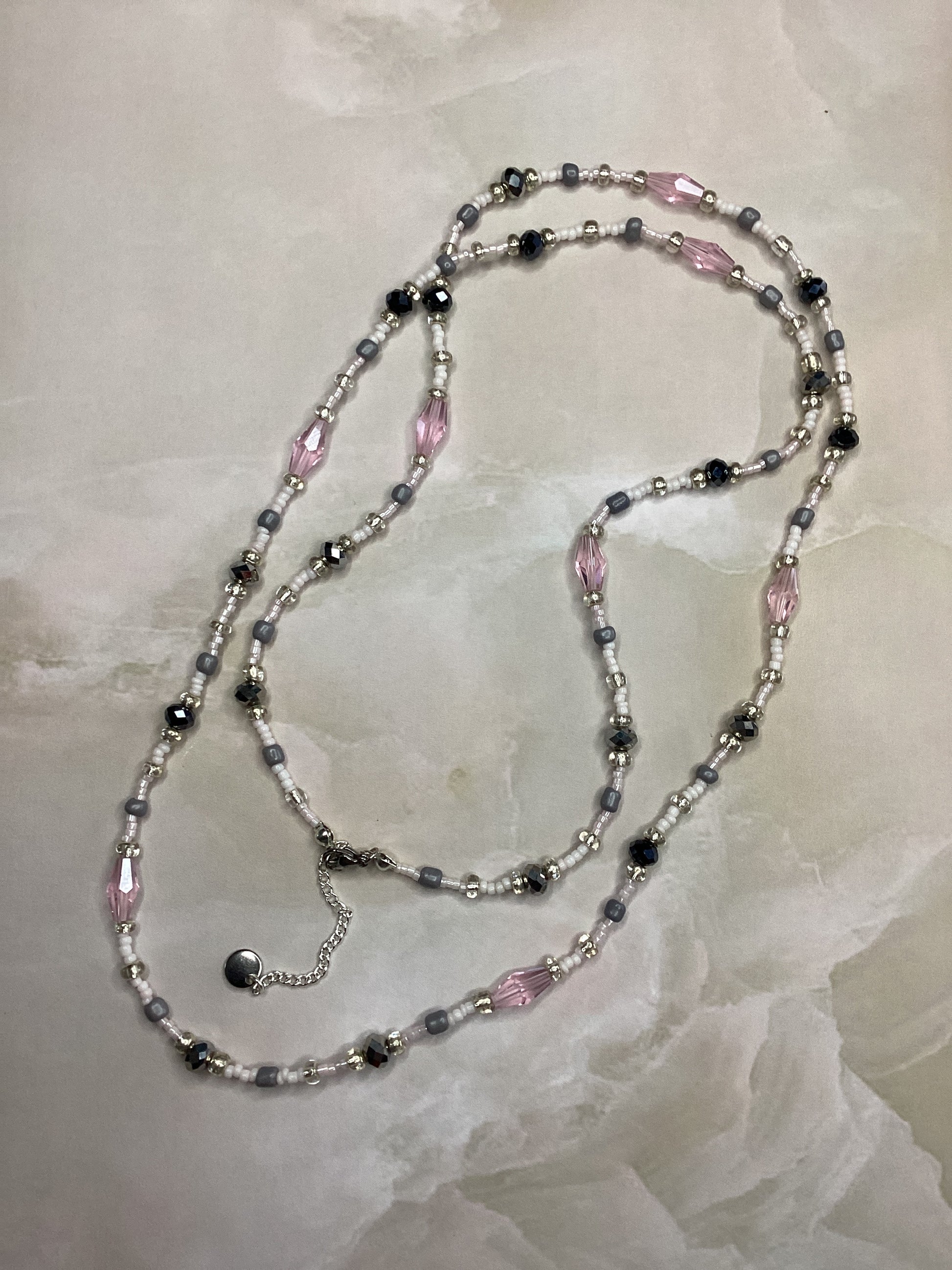 Eine 92 cm lange Damen Halskette aus glasschliffperlen und rocalles mit Karabiner Verschluss und 5 cm verlängerung Kettchen,in Farbe grau/weiss/rosa.
