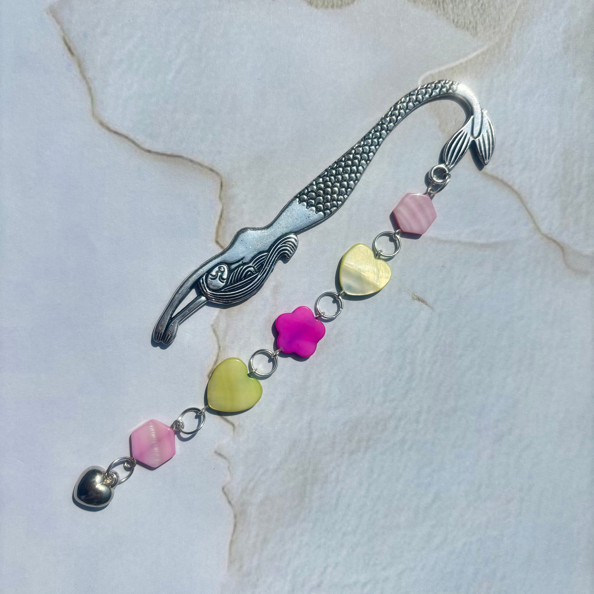 Ein sehr schönes Lesezeichen Jungfrau in der Farbe rosa/grün aus Muschel Perlen mit Herz Anhänger.