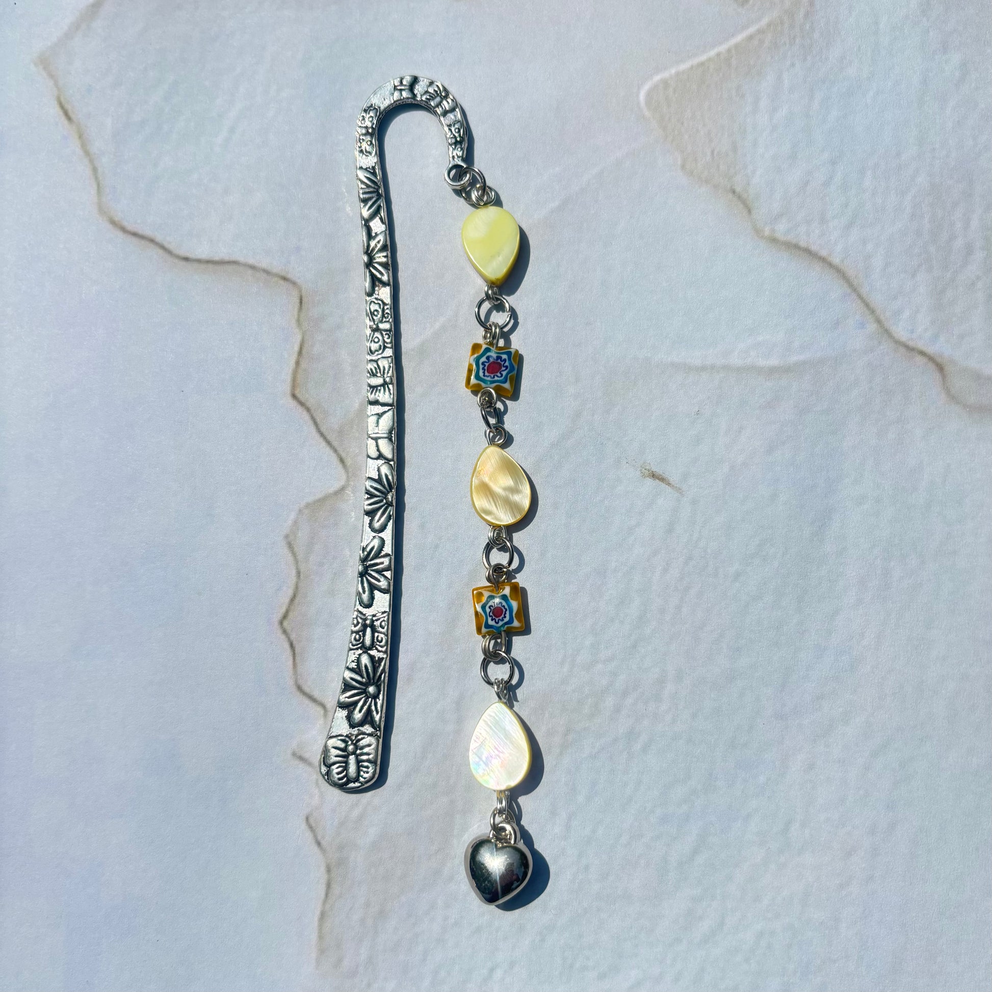 Ein sehr schönes Lesezeichen aus Muschel Perlen in der Farbe gelb mit einem Herz Anhänger.
