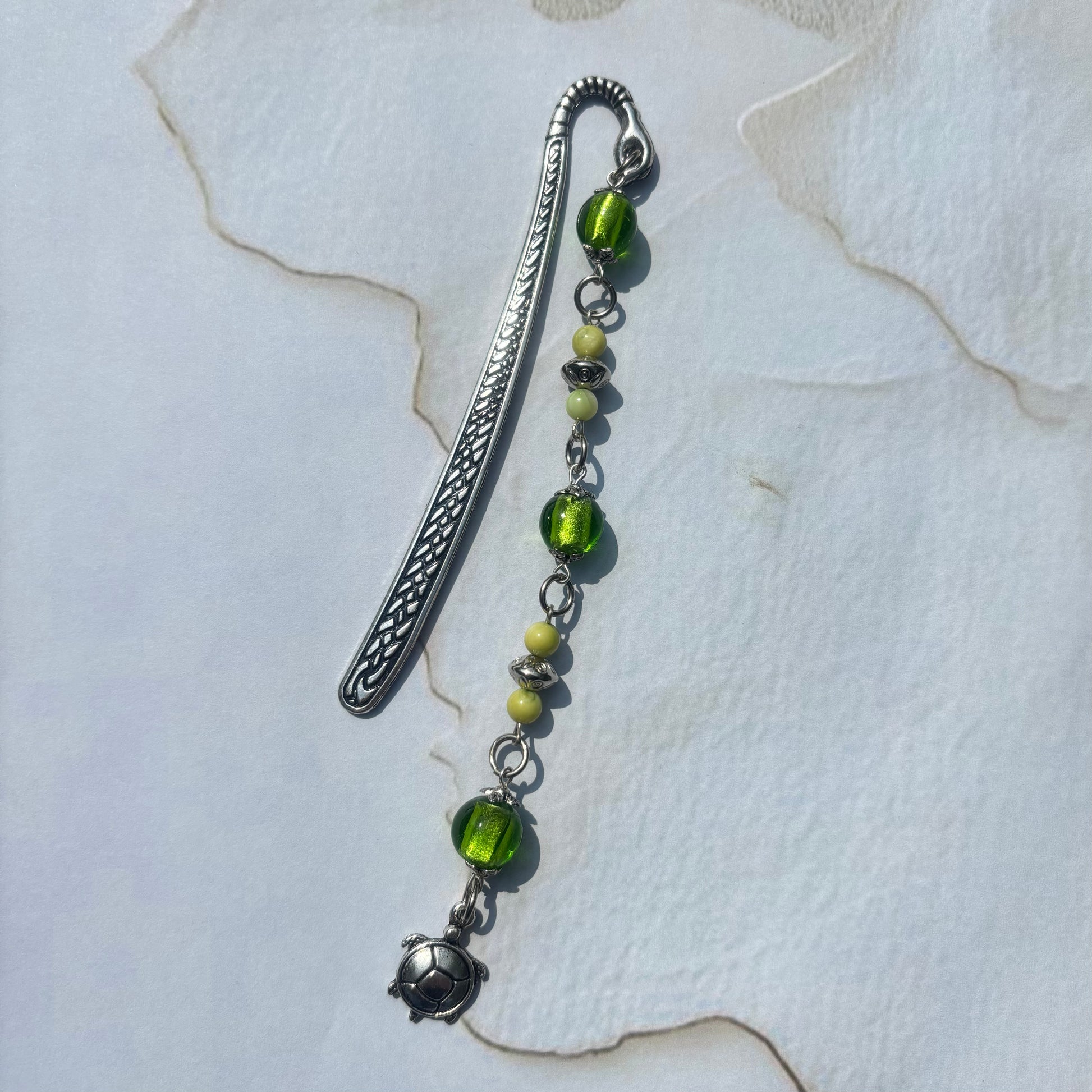 Ein sehr schöneres Lesezeichen aus Glasperlen und eine Schildkröte Anhänger in der Farbe grün.