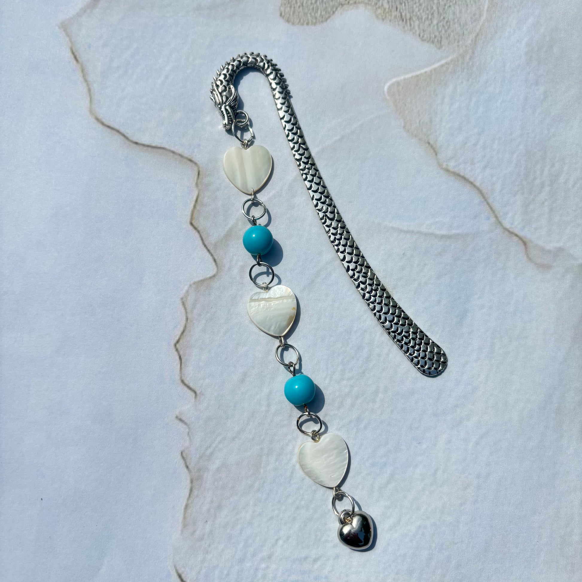 Ein sehr schönes Lesezeichen in der Farbe weiß/türkis .Ein Drache mit einem Herz Anhänger.