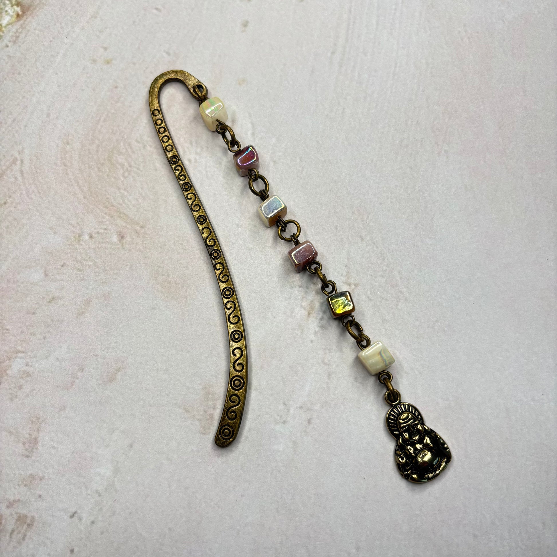 Eine sehr schöne Lesezeichen in der Farbe altgold und AB Beige Muschel Perlen.