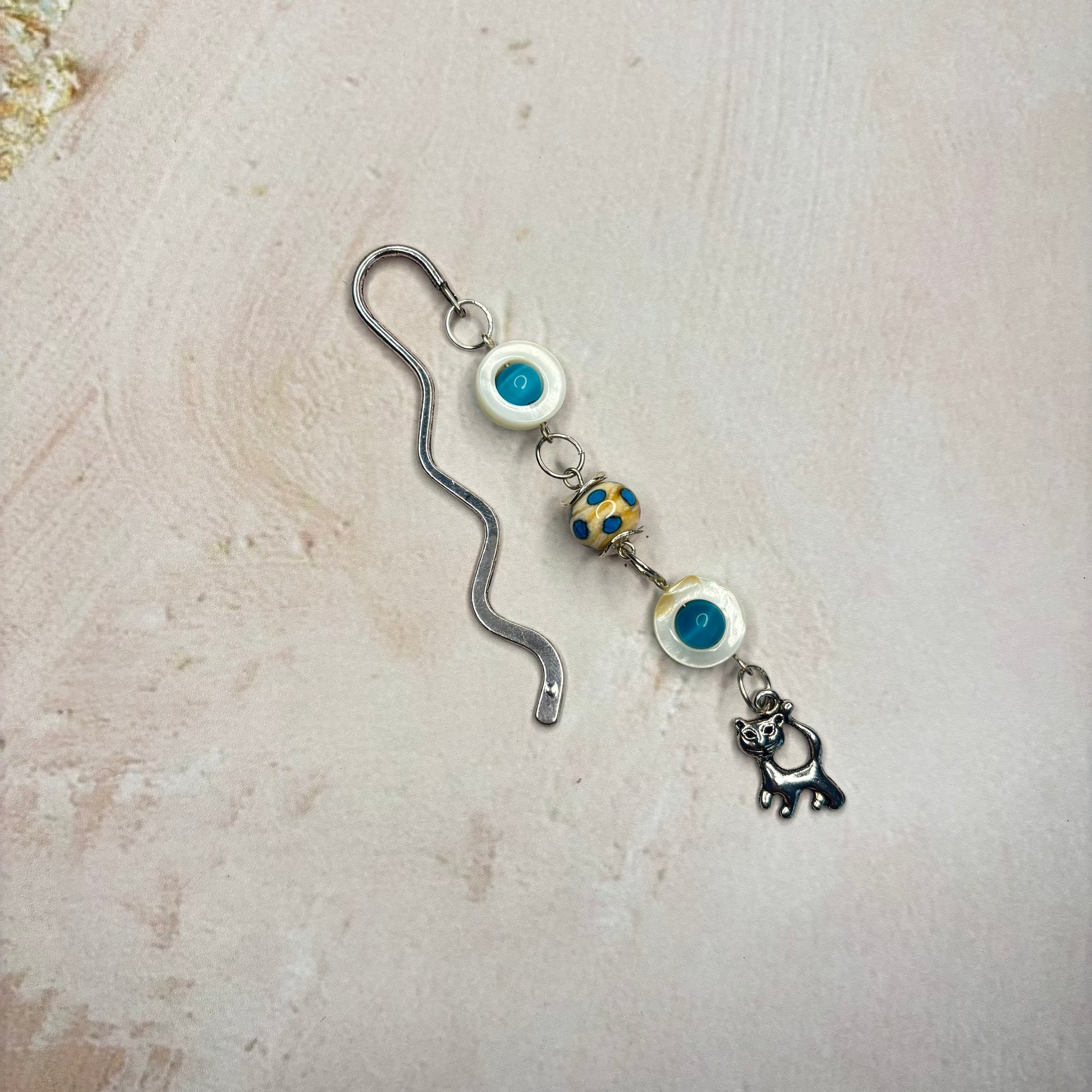 Ein sehr schönes, kleines Lesezeichen aus Glasperlen und Muschel Perlen in der Farbe Elfenbein/ türkis.