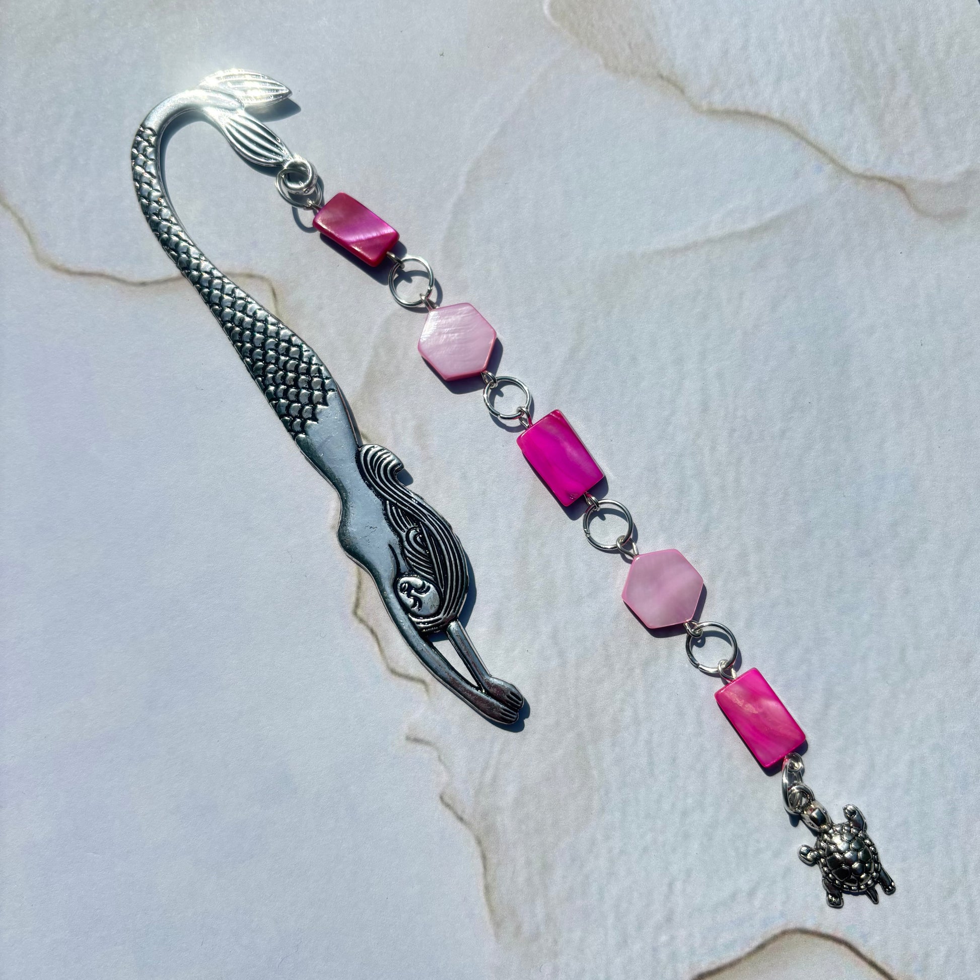 Ein sehr schönes Lesezeichen in der Farbe pink/rosa aus Muschel Perlen.Eine Jungfrau mit eine Schildkröte Anhänger.