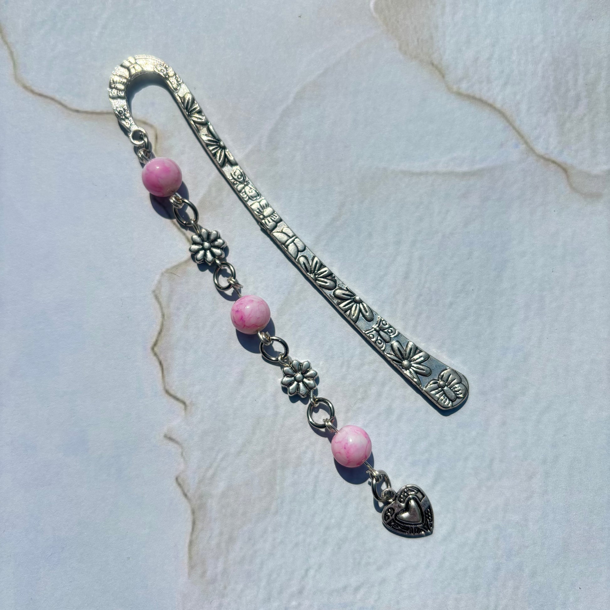 Ein sehr schönes Lesezeichen in der Farbe rosa mit Blumen und Herz Anhänger.