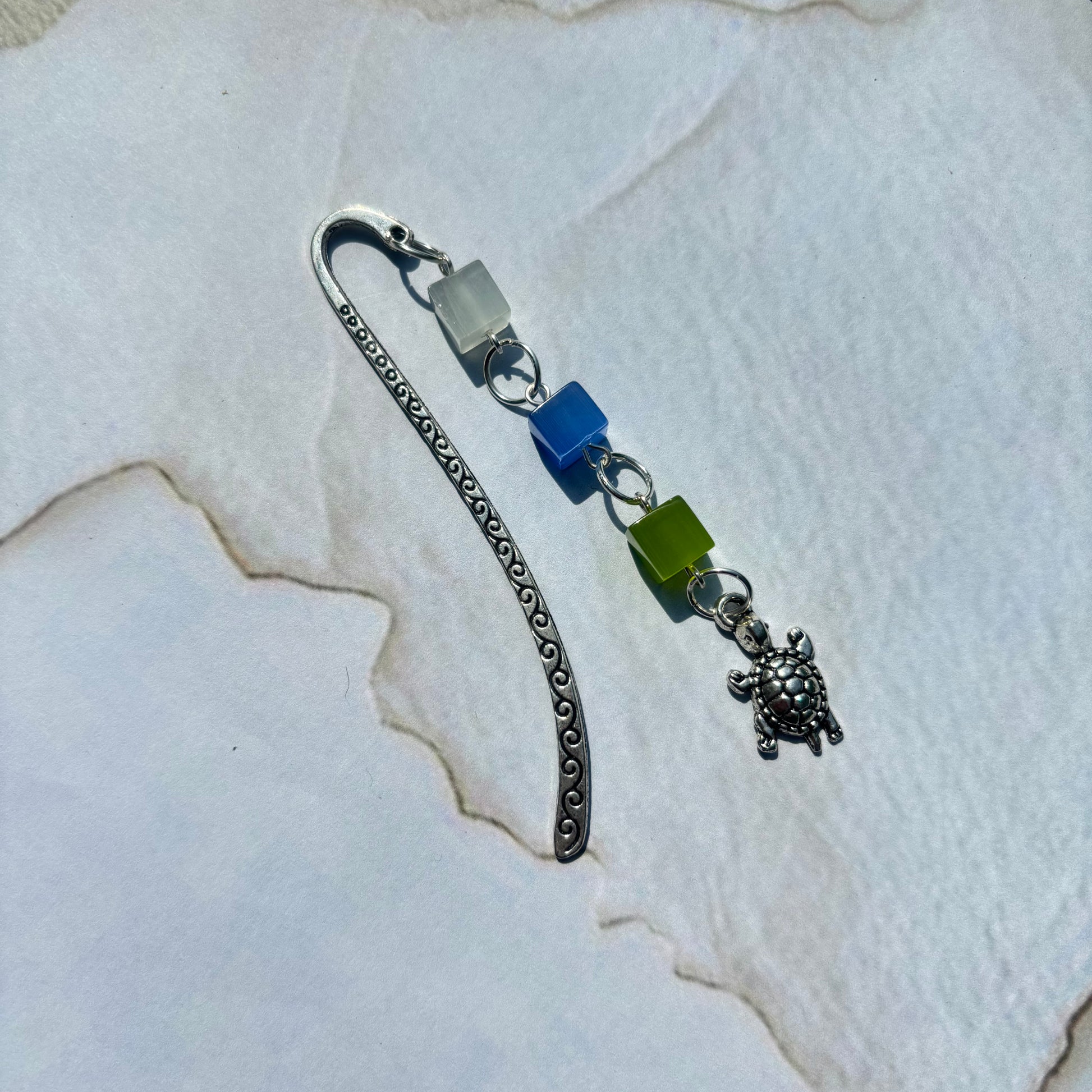 Ein sehr schönes kleines Lesezeichen in der Farbe weiß/blau/grün aus Glasperlen mit eine Schildkröte Anhänger.