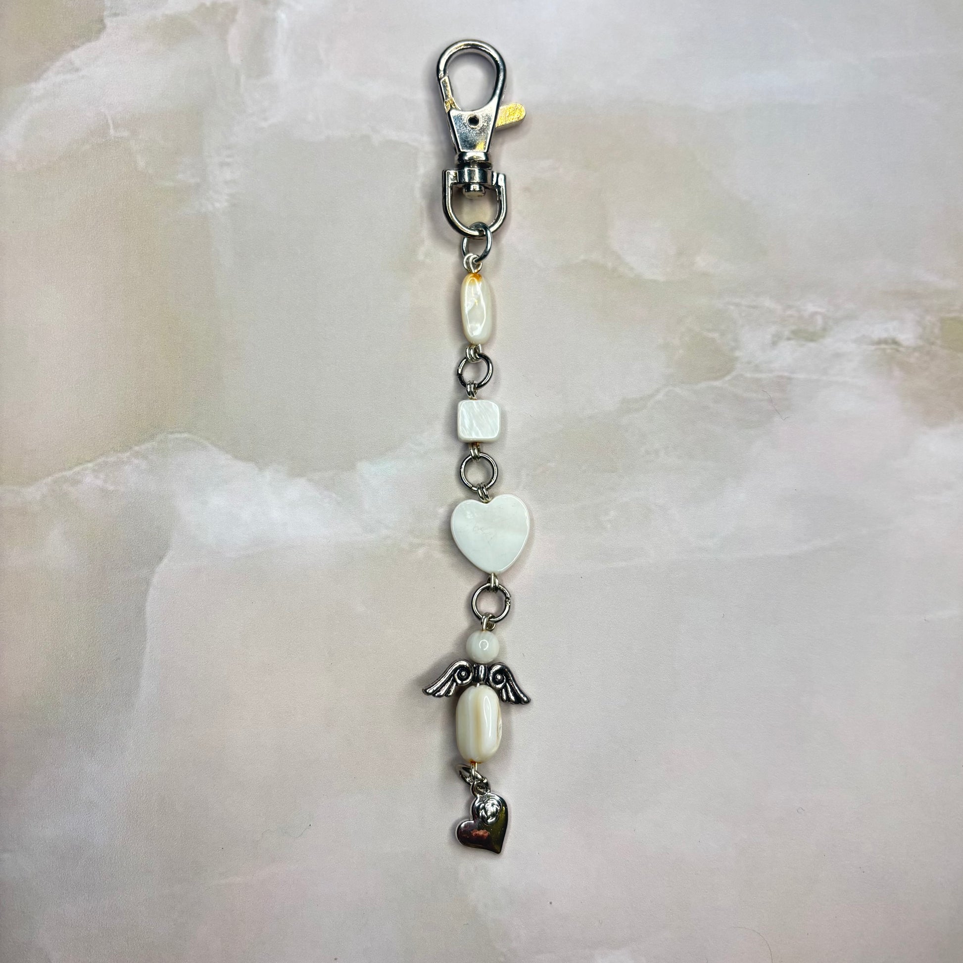 Ein sehr schöne Schlüsselanhänger aus Muschel Perlen in der Farbe beige/ Elfenbein , mit einem Karabiner Verschluss.