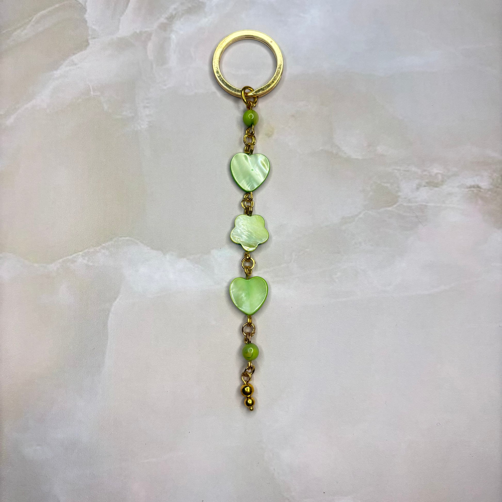 Ein sehr schönes Schlüsselanhänger in der Farbe Gold und aus hellgrünen Muschel Perlen .