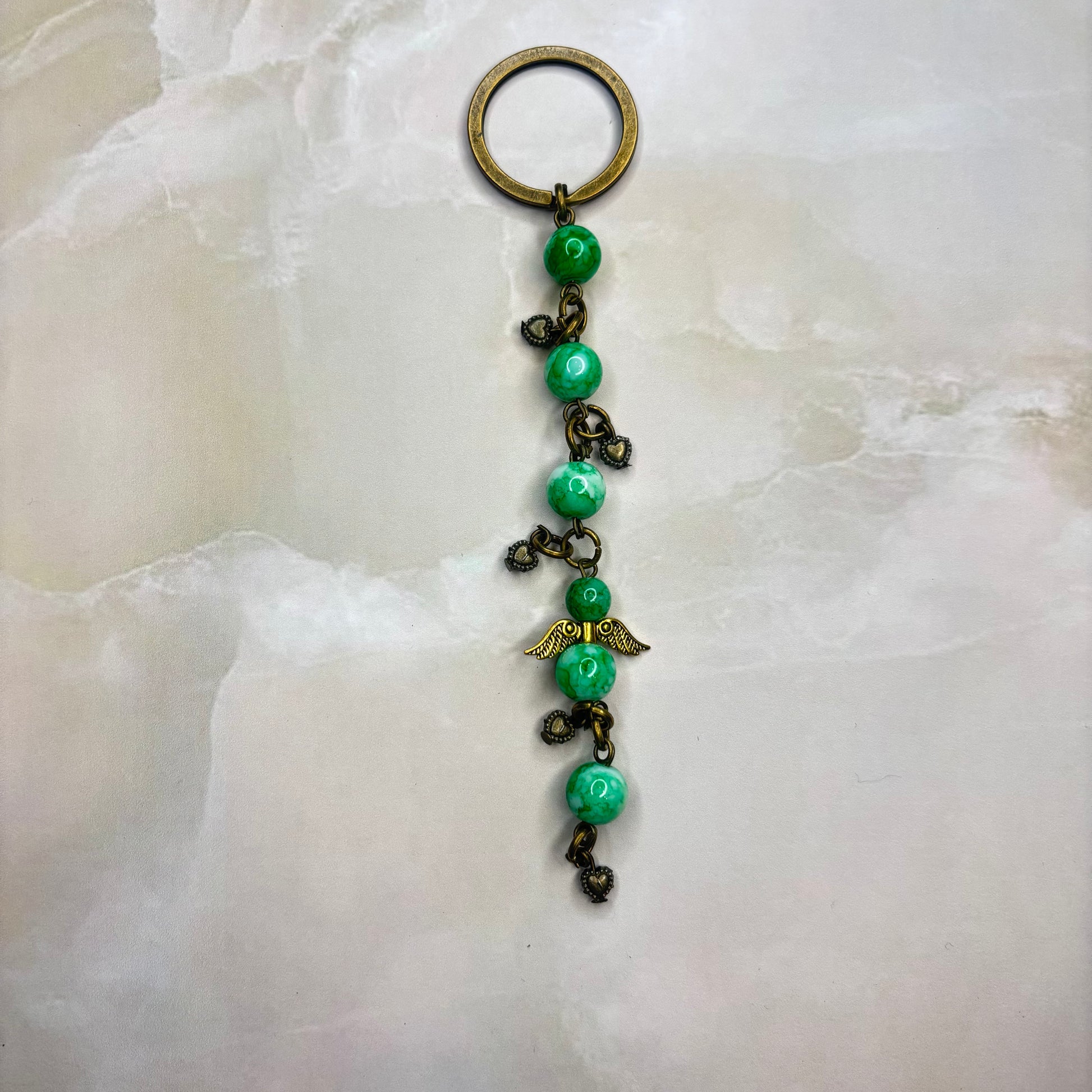 Ein sehr schönes Schlüssel oder Taschen Anhänger in der Farbe altgold und hellgrünen Glasperlen.