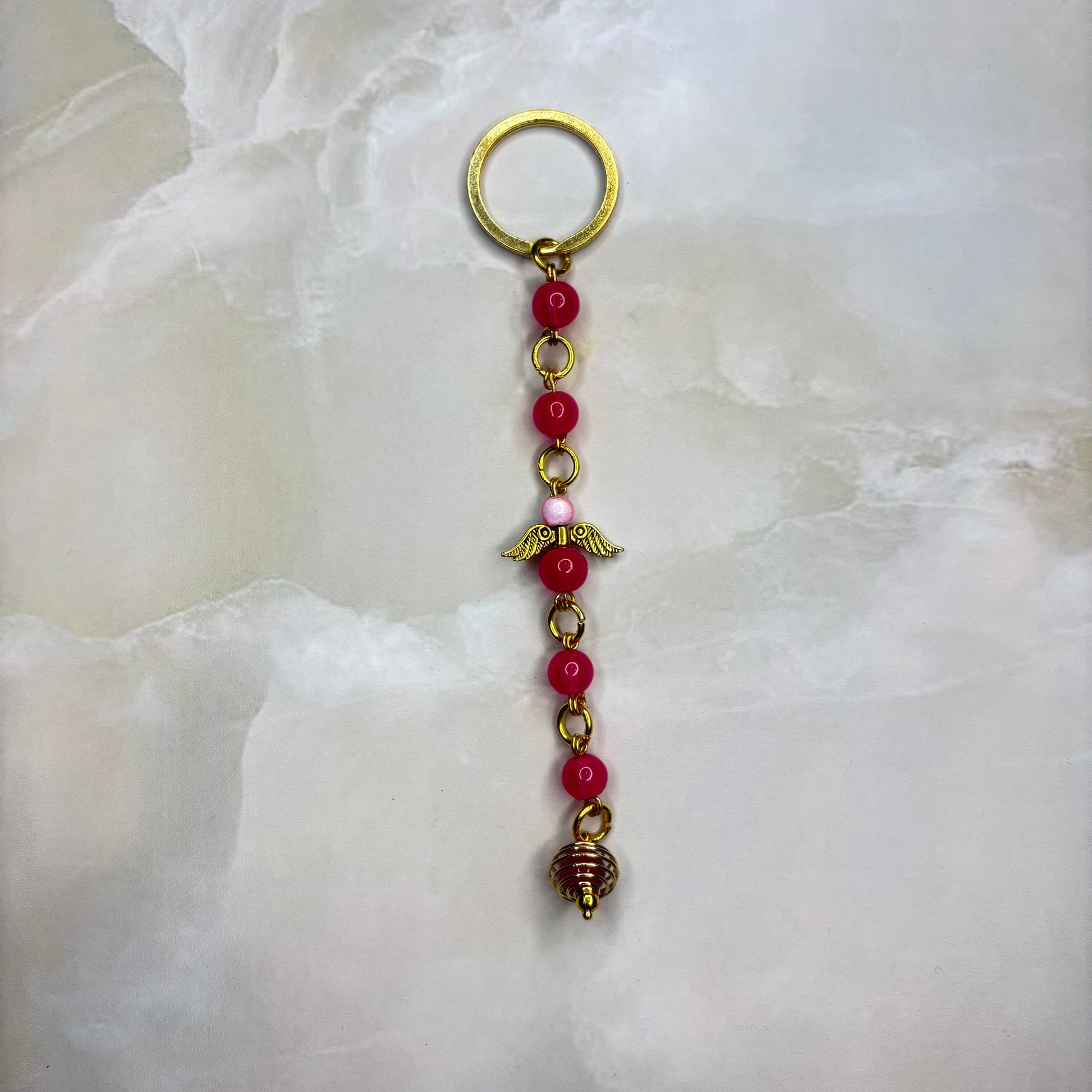 Ein sehr schönes Schlüsselanhänger in der Farbe Gold mit pinken Glasperlen.