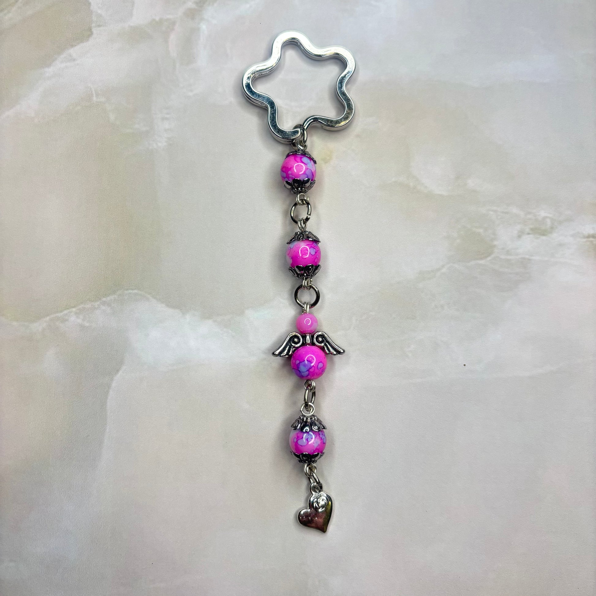 Sehr schönes Schlüsselanhänger aus Glasperlen in der Farbe Silber / pink / lila.