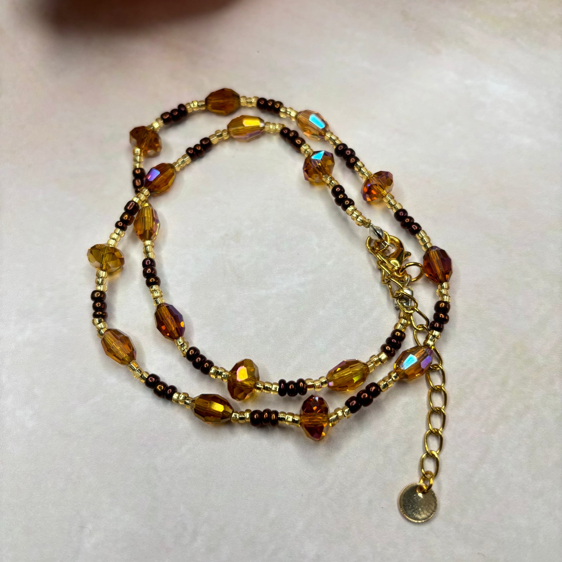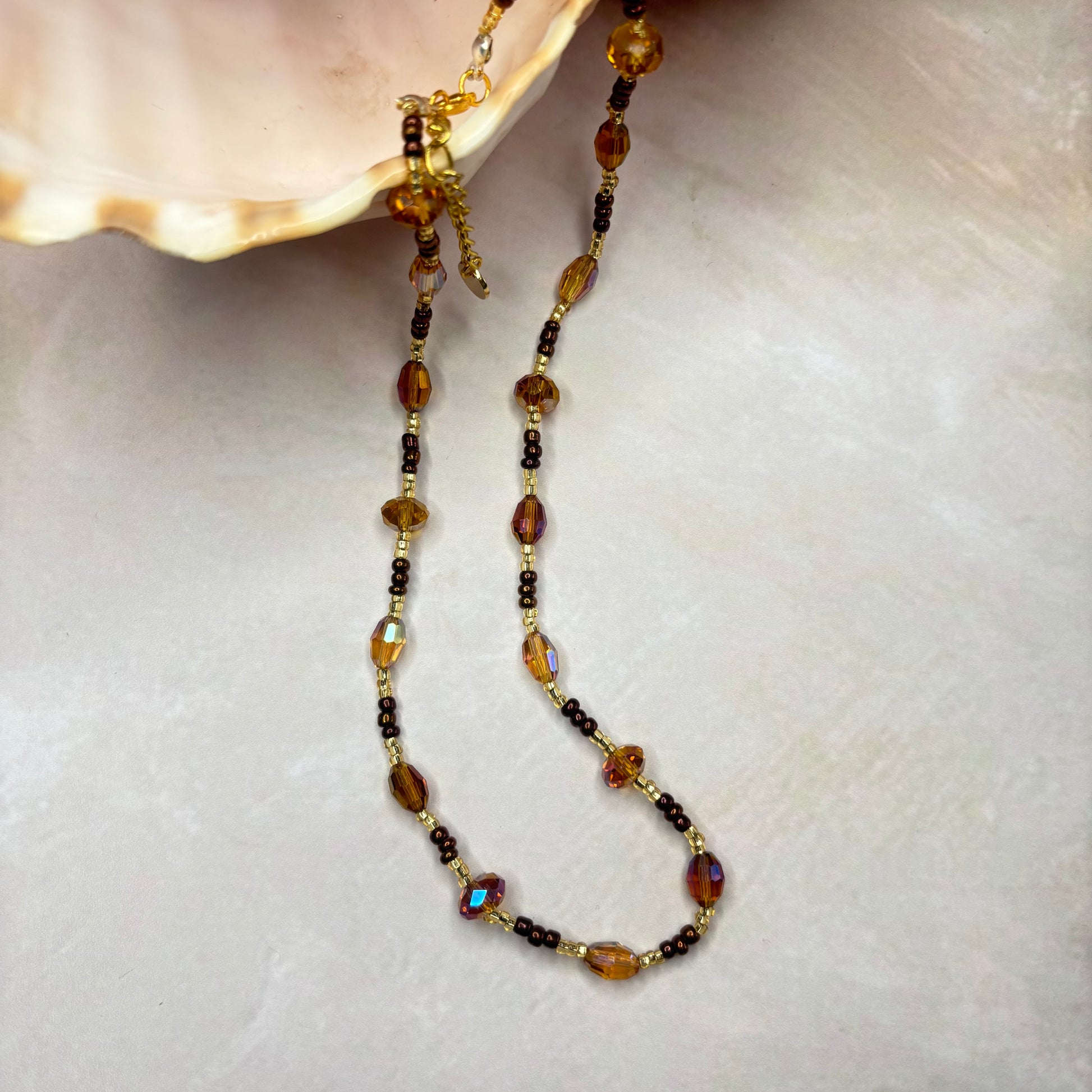Eine sehr Schöne Halskette aus Glasschliff Perlen,rocalles in der Gold/braun / Honig Farbe.Die ist 42 cm lang mit 5 cm Verlängerungs Kettchen Kette für jeden Anlass.